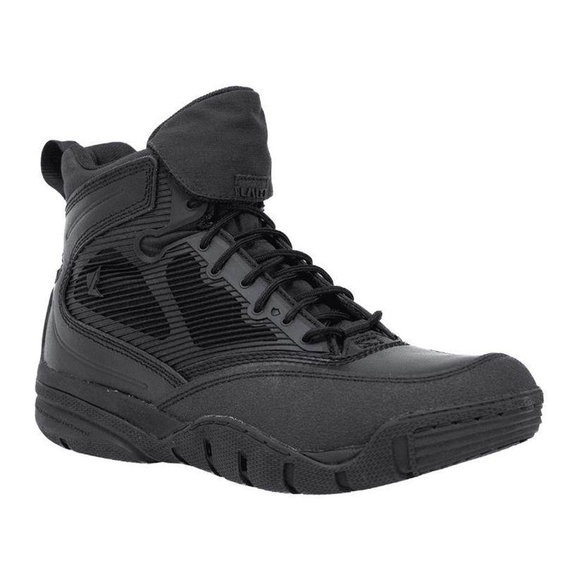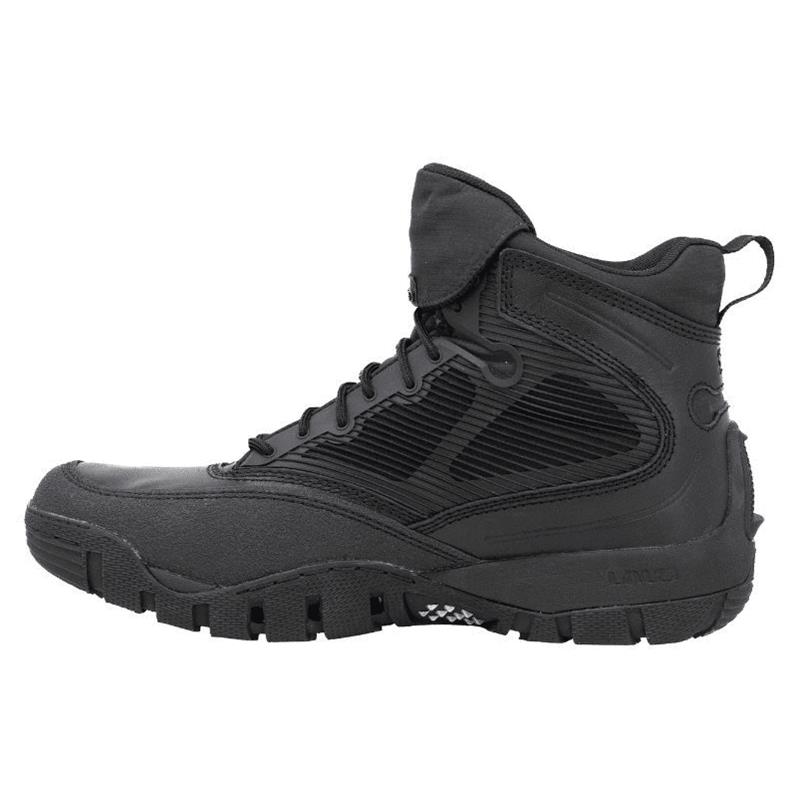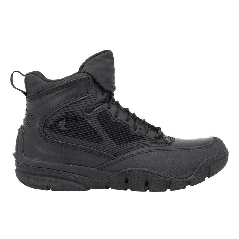 Characteristics: • Versatile intervention shoe • Recommended for amphibious operations • Double-way water drainage system • KPU grid to filter and prevent debris from entering the shoe while allowing good breathability • Tip of the foot profile adapted for keeping the fin • Housing for blocking the fin or the IR Glint band • Reinforced tip of the toe to limit fin abrasion • Metal pins (non-magnetic) on the inner side of the sole to control smooth rope • Pocket to store and hide laces • Antimicrobial and hydrophobic breathable lining • Non-slip, injection-moulded rubber sole • Articulated shape of the heel and outer sole for a stealthy and silent foot roll • Composite plate resistant to puncture with rotation for protection and to limit fatigue • Multi-density EVA midsole designed to cushion foot impact and propel when heel takes off • Lightweight and seamless construction for foot protection • Rip-stop nylon trim • Flexion footprint for Achilles heel • Full grain leather upper and TEK-DRY™ lining • Medium height • Weight (43/9.5us): 555 g • US size