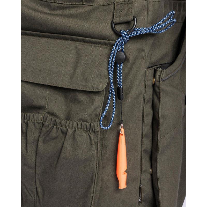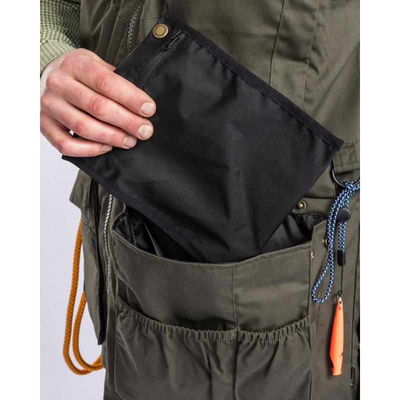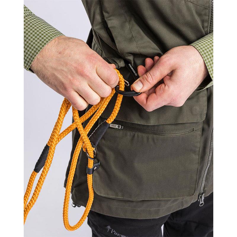 At the back, you'll find a large stretch pocket with two compartments for water bottles, allowing both you and your dog to stay hydrated throughout the day. The back pocket can hold 11 dummies of 500 grams each. At the front, two large magnetic closure hand-rest pockets are easily accessible and convenient for quickly retrieving your belongings. The left pocket is equipped with a bag, ideal for storing treats. The vest also has fleece-lined hand-warmer pockets, two inner zipped pockets, a mobile phone pocket, and two zipped chest pockets for secure storage. The vest closes easily with a two-way zip and adjusts at the back and bottom thanks to a concealed drawstring. At the waist, you'll find a D-ring and a sturdy carabiner, perfect for attaching leashes or other items.