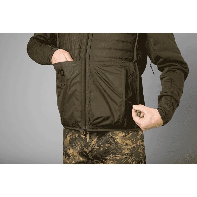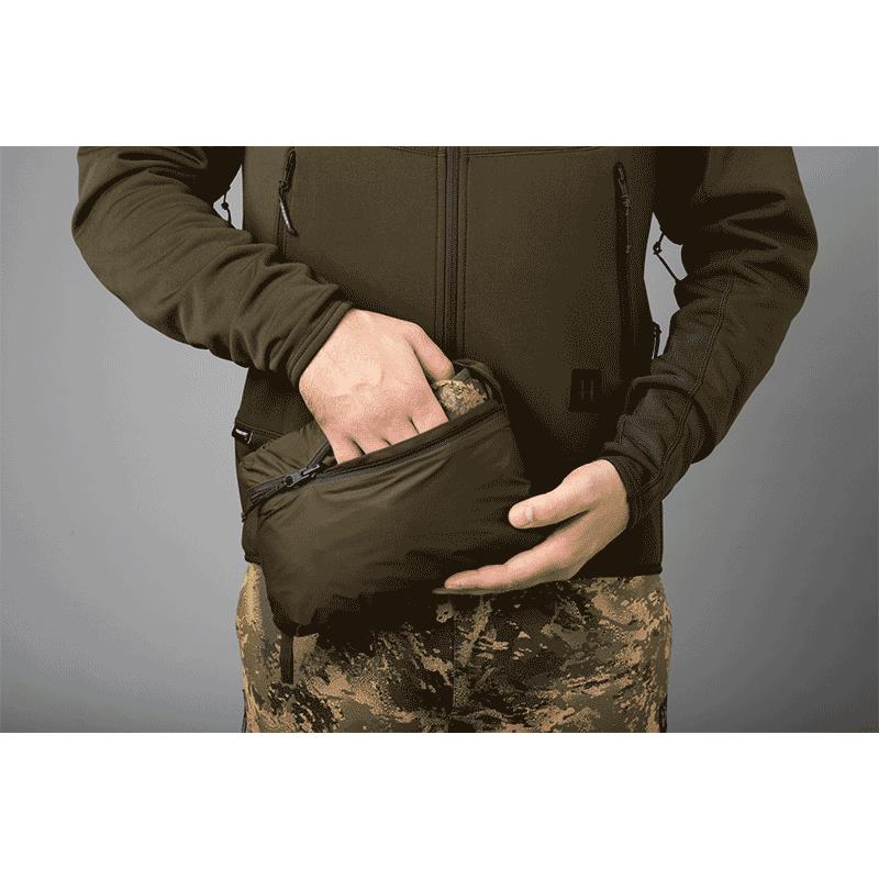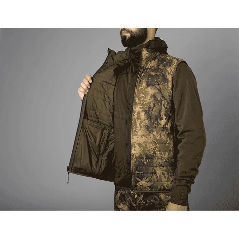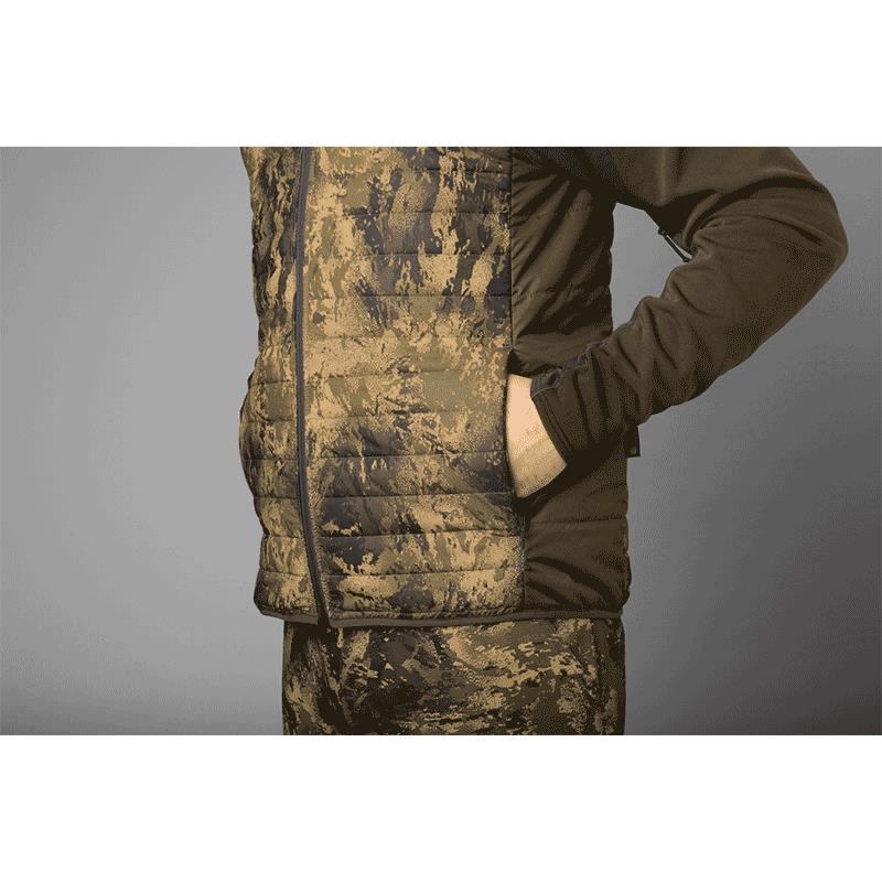 Features: • High collar • Zippered side pockets on camouflage side • Open pockets and zippered pocket on solid side • Packable into its own pocket • Elasticated cuffs and bottom hem • Reversible