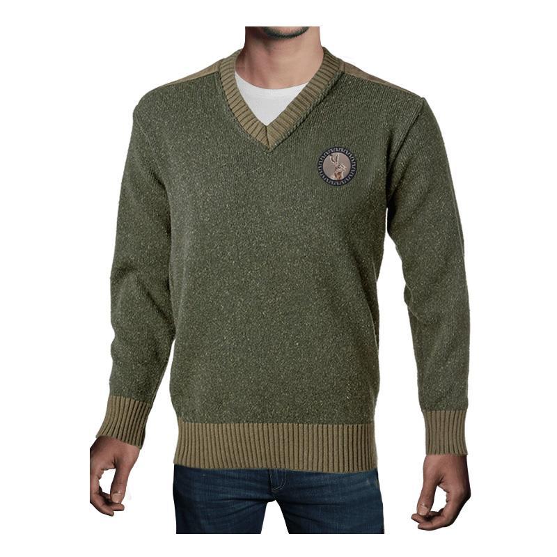 Features: • Jersey knit sweater. • 30% wool, • 7 gauge, • inside and outside gauge. • Contrasting collar and ribbed edges on the sleeves and waist, • suede patches on the shoulders. • Product washed and softened for a soft touch.