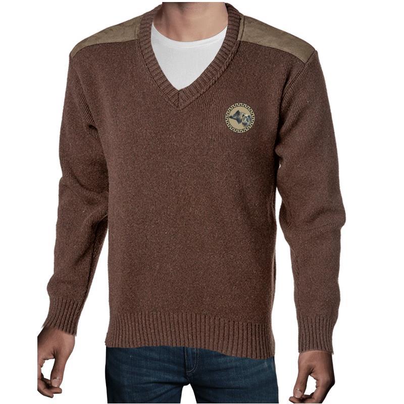 Features: • Jersey knit sweater. • 30% wool, • 7 gauge, • inner and outer gauge. • Contrasting collar and ribbed hems on sleeves and bottom, • suede patches on shoulders. • Product washed and softened for a soft touch.