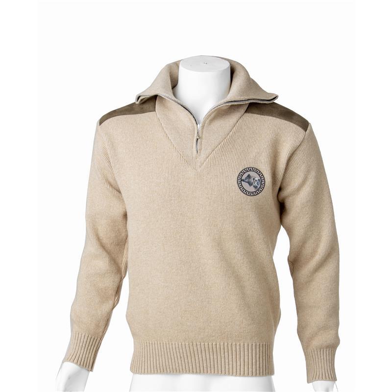 Features: • Jersey knit sweater. • 30% wool, • 7 gauge, • inner and outer gauge. • Contrasting collar and ribbed edges on the sleeves and waist, • suede patches on the shoulders. • Washed and softened product for a soft feel.