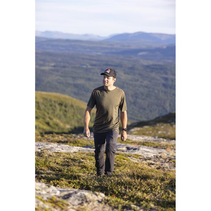 Quick-drying merino wool t-shirt. Ideal for hiking and other active outings as it wicks away moisture and provides great breathability. This t-shirt, made from a blend of merino wool and polyester, is perfect for various outdoor activities thanks to its quick-drying and moisture-wicking properties. The used merino wool is mules-free and wicks moisture from your body, ensuring quick drying. This is an easy-to-care men's t-shirt, which is suitable for both warm and cool days. Unlike materials like cotton, wool and polyester retain their insulating properties even when wet, making this t-shirt a versatile choice for a range of weather conditions.