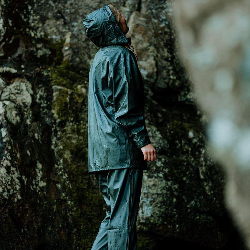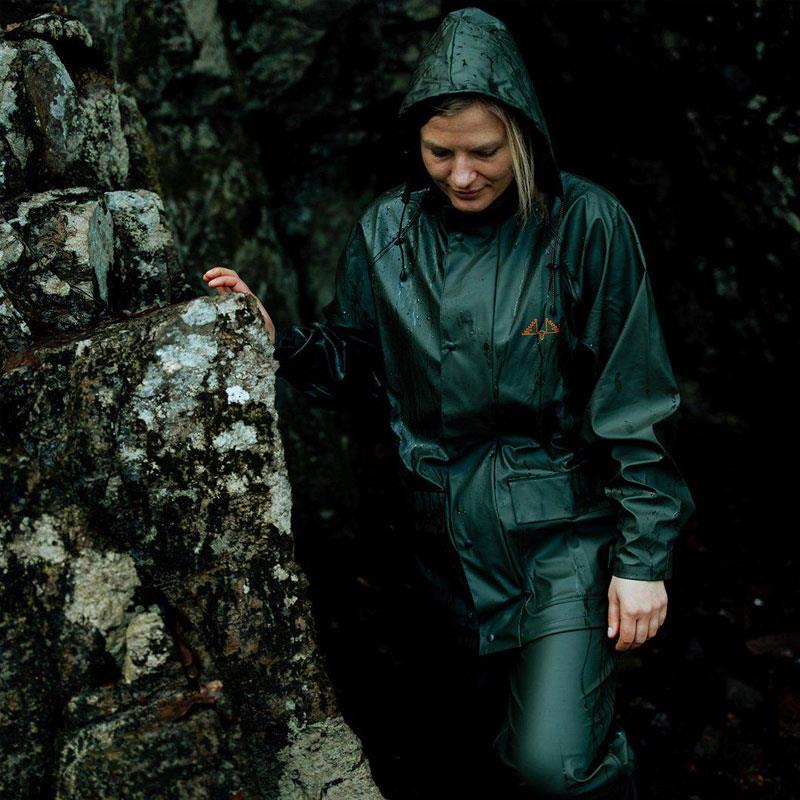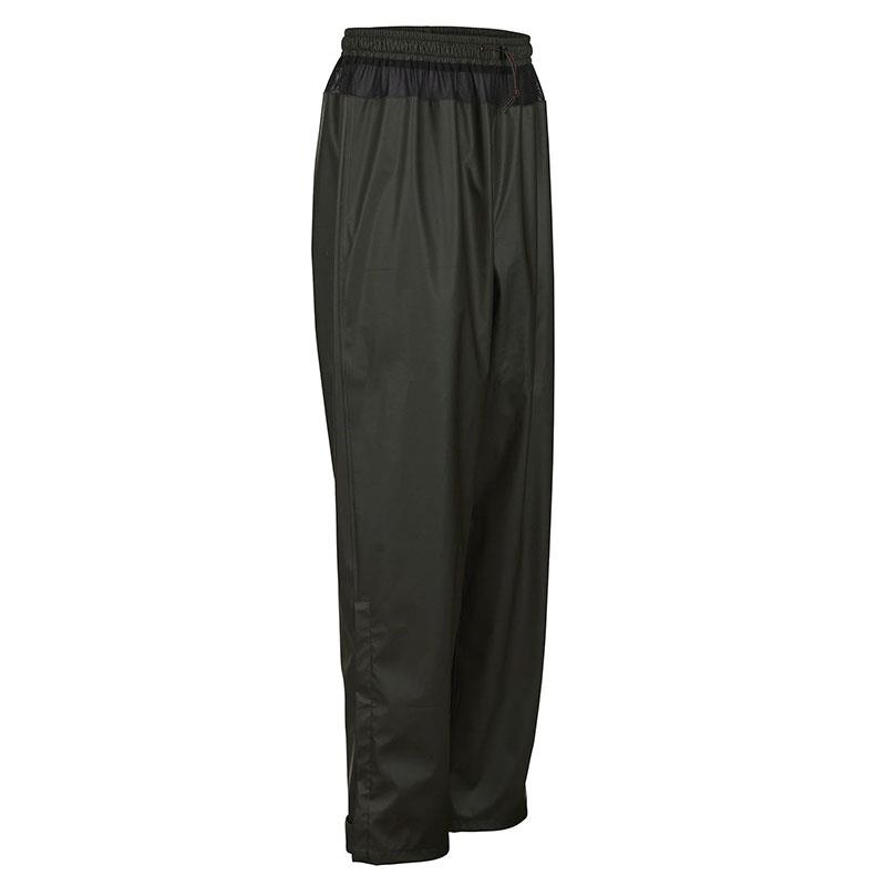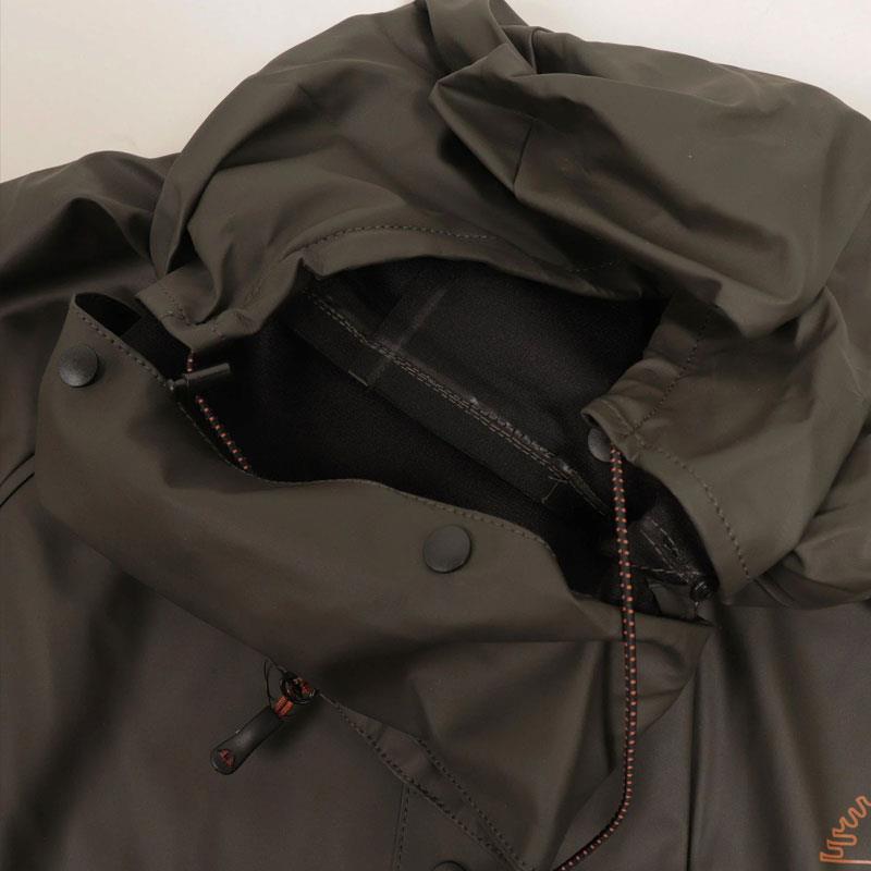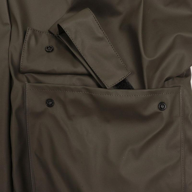 • Waterproof rain attire with a long and roomy jacket. • The jacket's double front pockets provide good storage. • The interior is brushed polyester for added comfort. • The trousers feature a net at the waist for better ventilation.