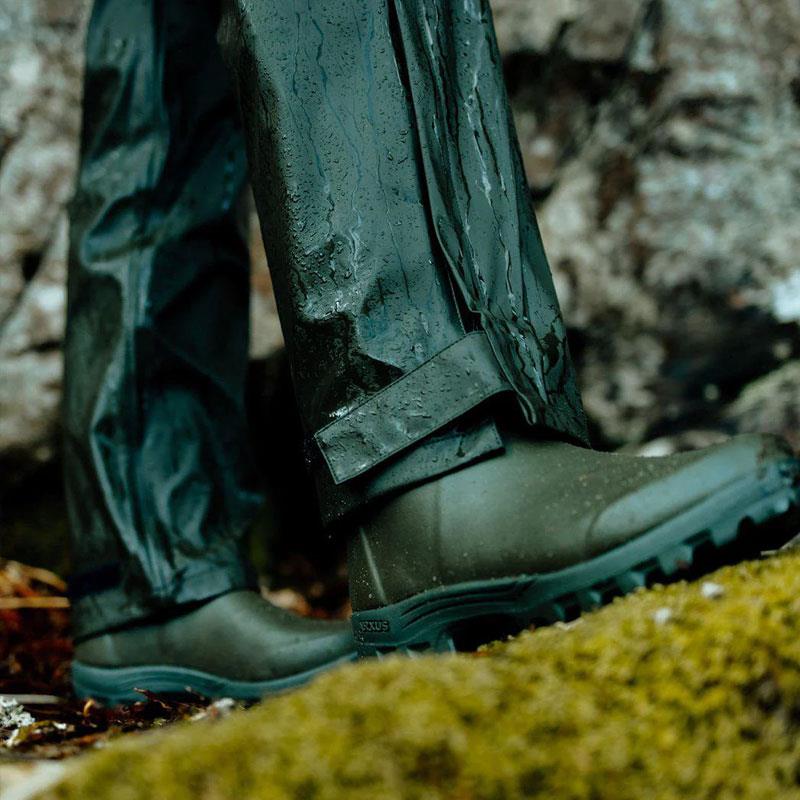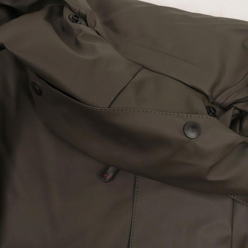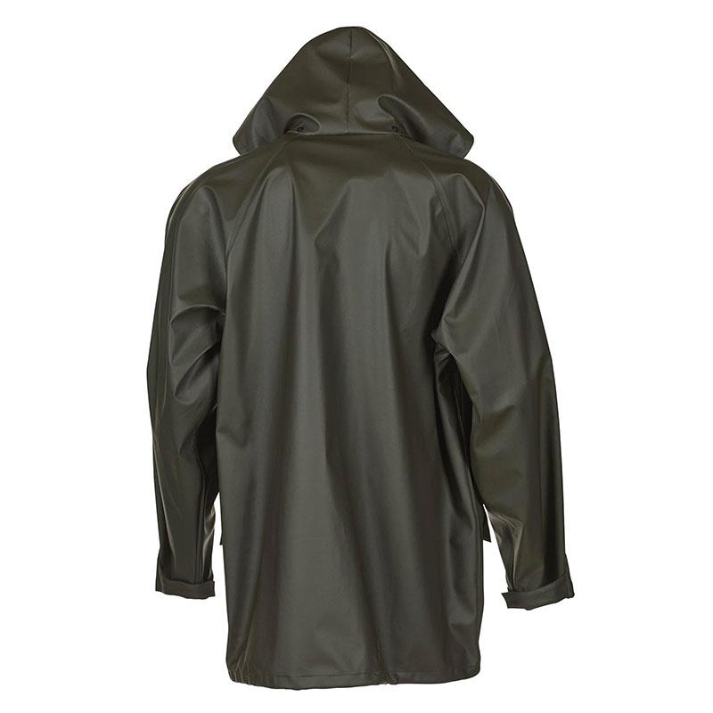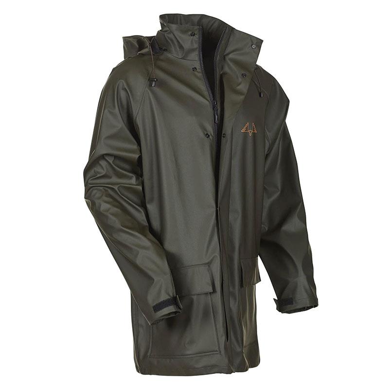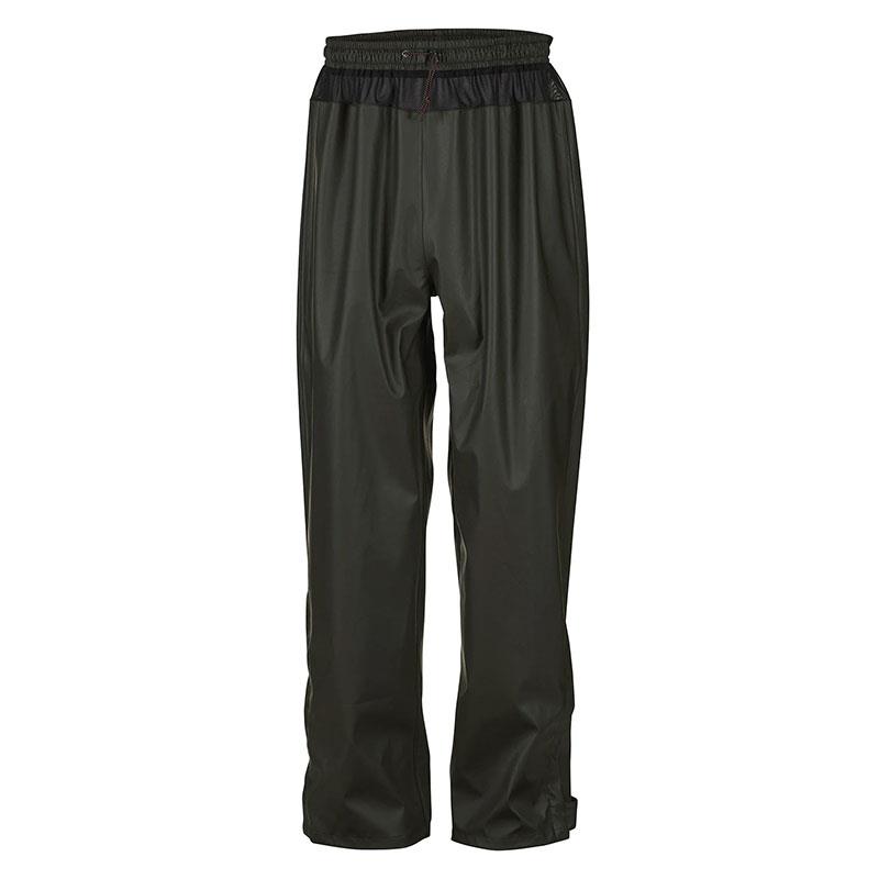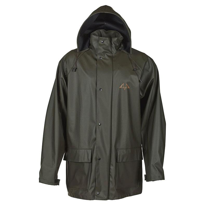 • Waterproof rain attire with a long and roomy jacket. • The jacket's double front pockets provide good storage. • The interior is brushed polyester for added comfort. • The trousers feature a net at the waist for better ventilation.