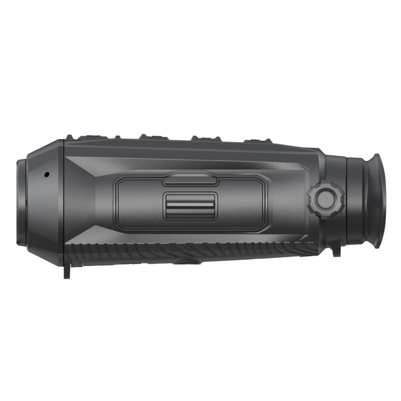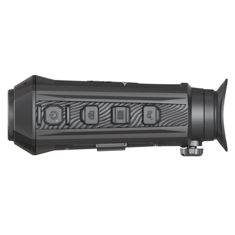 • Detector type: 12 μm uncooled VOx focal plane array • Resolution: 384 × 288 • Refresh rate: 50 Hz • Response band: 8 μm to 14 μm • NETD: Less than 20 mK (25 °C, F# = 1.0) • Lens (focal length): 15 mm, F1.0 • Field of view (H × V): 17.5° × 13.1° / 30.8 m × 23.0 m • Magnification: 1.5x, 3x, 6x, 12x • Focus mode: Fixed focus • Minimum focus distance: 1.5 m • Detection range (6-foot object: 750 m • Display: 1024 × 768, 0.39 inch, OLED • Diopter adjustment: -5 D to +3 D • FFC (flat field correction): Automatic, semi-automatic, manual • Palettes: Black hot, White hot, Red hot, Fusion • Exit pupil: 6 mm • Eye relief: 20 mm • Scene mode: General, compressed • Brightness adjustment: Yes • Tone adjustment: Cool, Warm • Contrast adjustment: Yes • Hot spot: Yes • Standby mode: Yes • Built-in storage: Integrated EMMC (16 GB) • Video/Audio recording: Yes / Yes • Image capture: Yes • Hot track: Yes • Distance measurement: Yes • PIP: Yes • Battery type: One replaceable rechargeable 18650 lithium battery • Battery life: Up to 6.5 hours of continuous operation (at 25 °C, Wi-Fi disabled) • Power: USB Type-C interface 5 VCC/2 A. Supports external power. • Operating temperature: -30°C to +55°C (-22°F to 131°F) • Protection level: IP67 (Waterproof) • Dimensions: 165 × 60 × 64 mm (6.3 × 2.4 × 2.5 inches) • Weight (without batteries): 0.3 kg (0.66 lb)