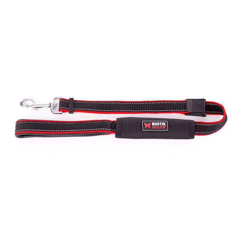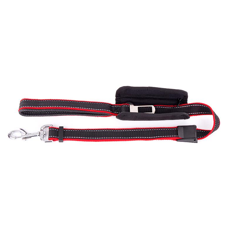Features: • Black car safety leash. • Universal car safety buckle that slips into a pouch for walks. • Zippered pouch for waste bags. • Fleece handle. • Carabiner snap hook.