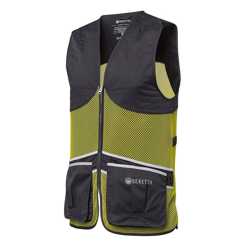Features: • Elastic shoulder slit for a comfortable fit, in the colors of Beretta's iconic straps. • Padded cotton anti-recoil patch with Beretta topstitching. • YKK drop closure. • Breathable mesh on the front and back. • Large front pockets. • Contrasting printed Beretta logo on the left pocket. • Beretta Active design on the back that accentuates athletic movement. • Contrasting rubber Beretta logo patch applied to the upper back. • Extra-strong loop to store towels/earmuffs on the back with a rubberized button. • Internal pockets for the 'Beretta Recoil Reducer', not included with the garment. • Internal adjustment cord.