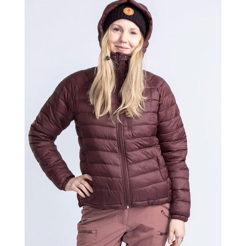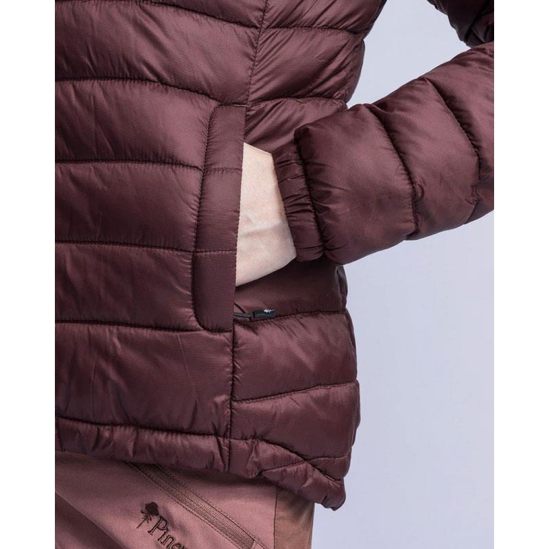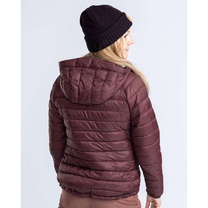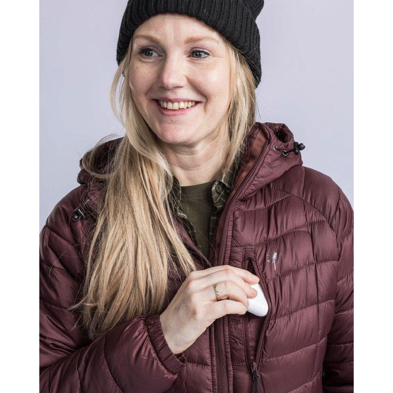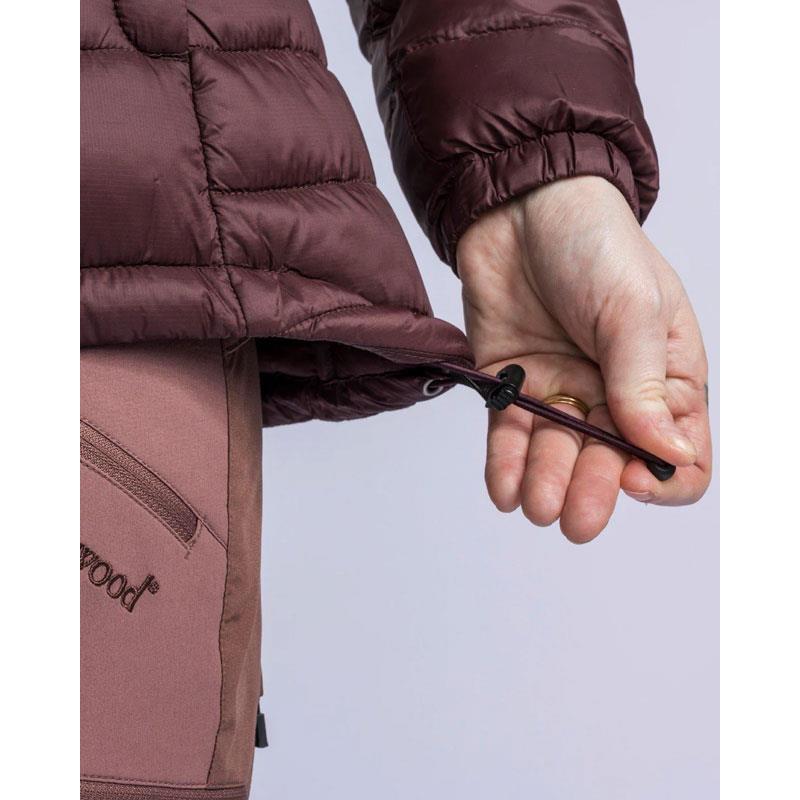 The Abisko Insulation women's jacket is as functional as it is eco-friendly, thanks to its filling made of polyester produced from recycled PET bottles. This filling, with a loft factor of 550+, is blown into channels, like down, but more eco-friendly. Windproof, slightly water repellent and lightweight, it is fitted with zippered front pockets and a chest pocket. Its reinforced hood is adjustable with a drawstring to protect the head from humidity and cold. A drawstring also allows to adjust the bottom of the jacket.