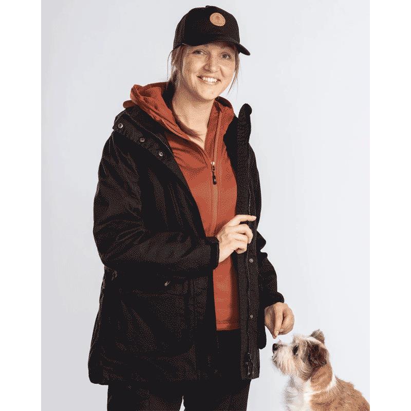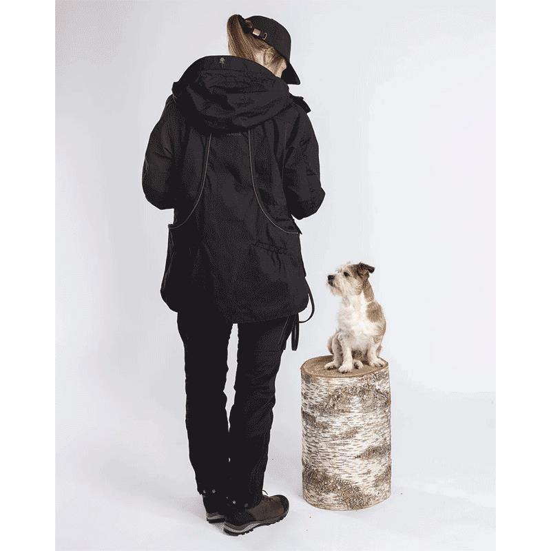 Women's dog sports jacket, windproof and treated for improved water resistance. Its fabric offers excellent breathability and its waxed surface features TC-stretch side panels for enhanced mobility. The hood can be detached, which allows for it to be removed in warm weather, and the side ventilation zips open to let in air if you get too hot.