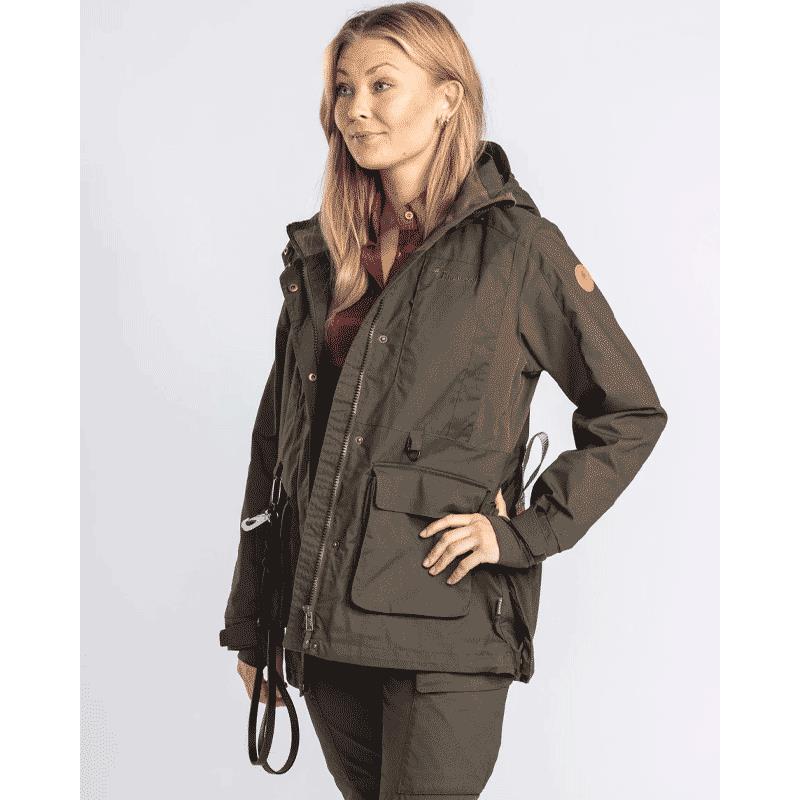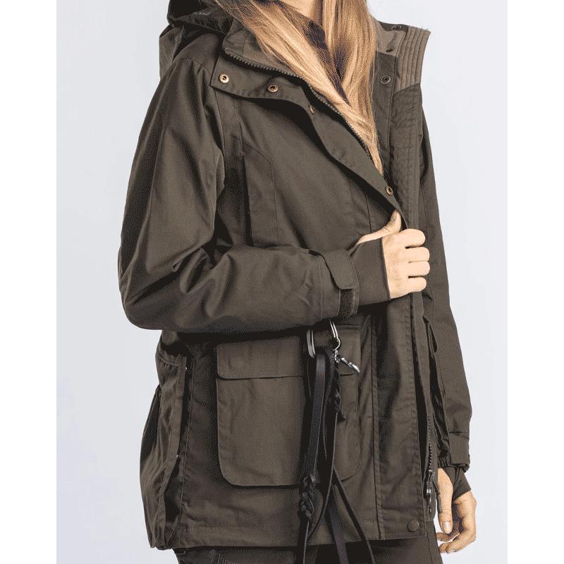 Sport dog jacket for women, windproof and treated for better waterproofing. Its fabric offers excellent breathability and its waxed surface is equipped with side inserts in TC-stretch for better mobility. The hood is removable, which allows you to remove it in warm weather, and the side ventilation zips open to let in air if you get too hot.