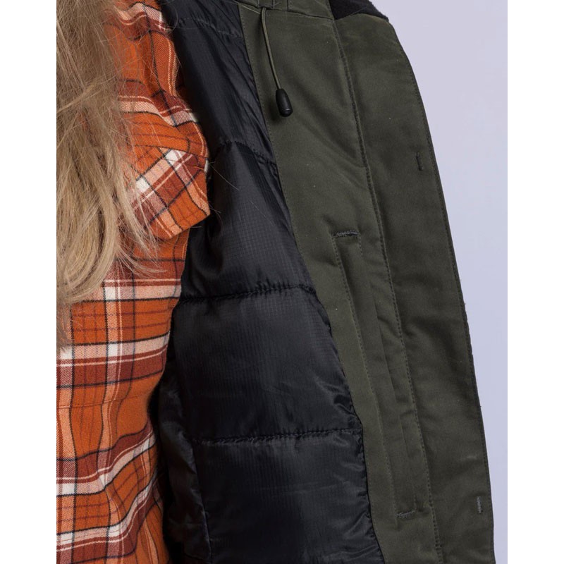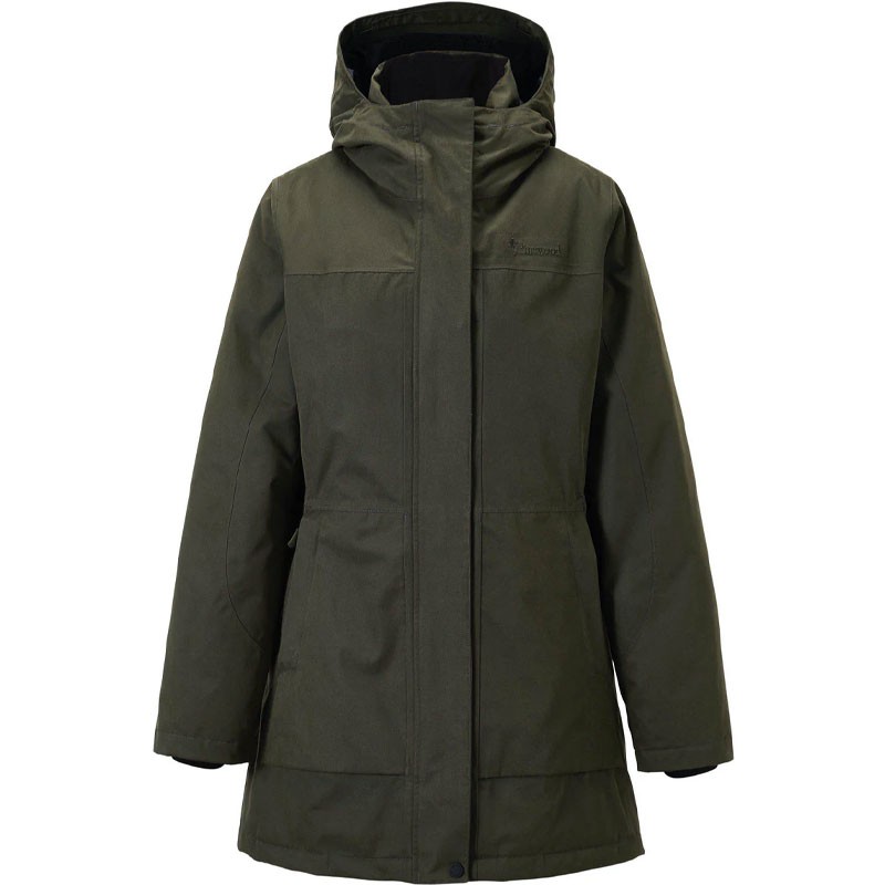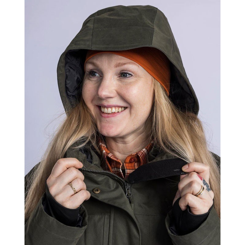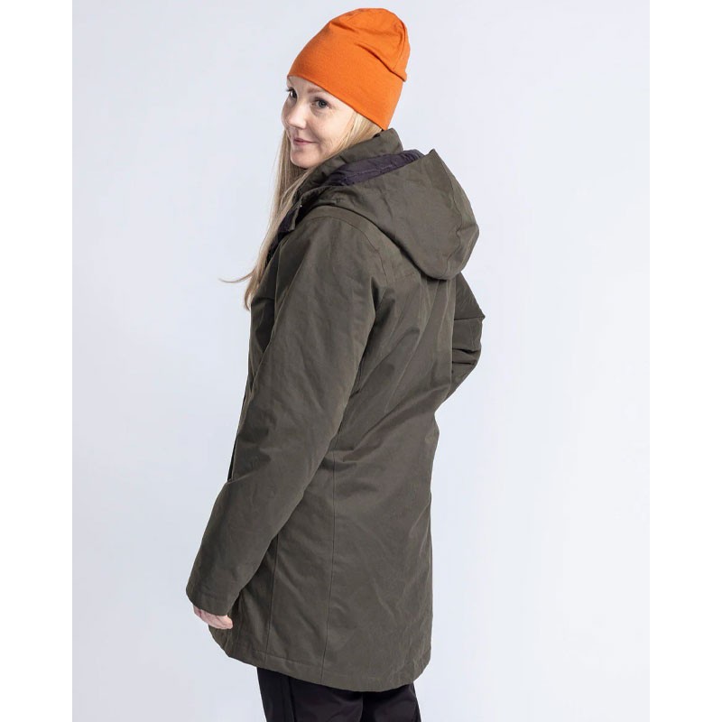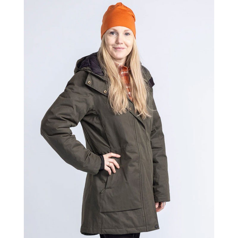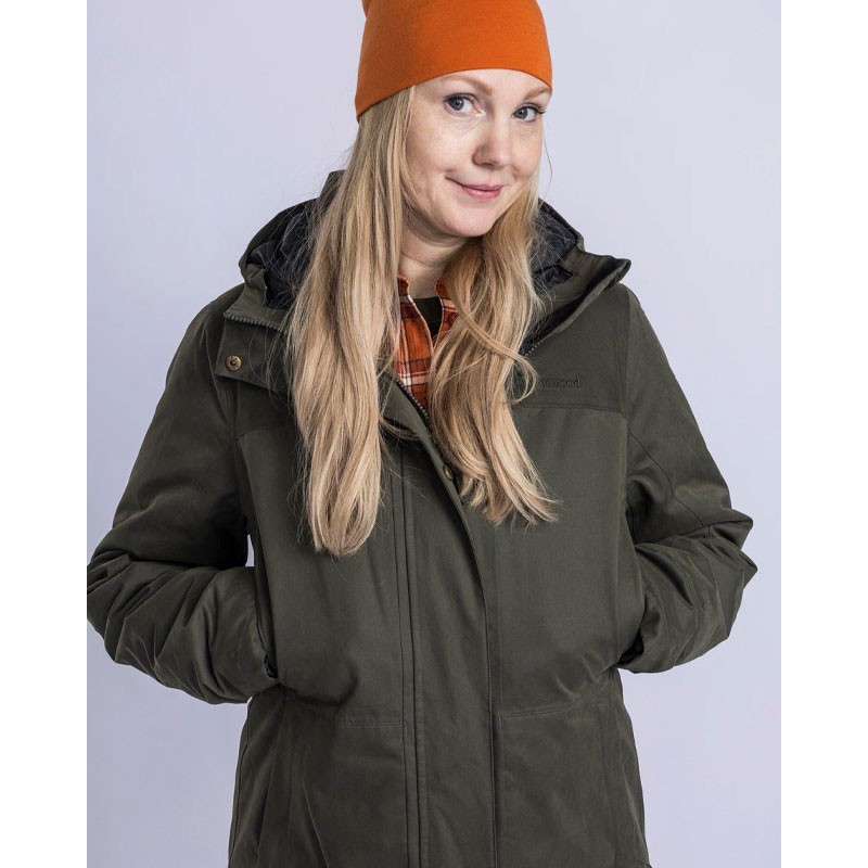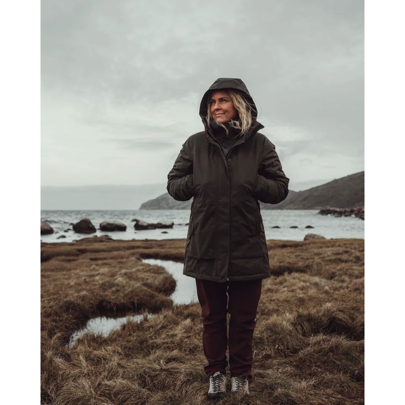 A warm jacket for women designed to protect from wind, moisture, and cold, equipped with practical pockets and warming features.