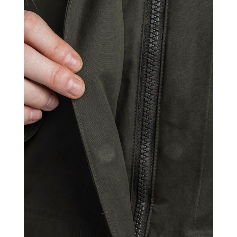 The parka has large front pockets with magnetic flap, two chest pockets, an inner zippered pocket, and fleece-lined handwarmer pockets to warm your hands in cold weather. The hood with an reinforced brim is adjustable by drawstring and its integrated collar lined with fleece offers optimal comfort around the neck and throat. The high collar protects from rain and bad weather, while the zipper is protected from moisture by a magnetic button flap. The sleeves have integrated cuffs with foldable thumb holes.