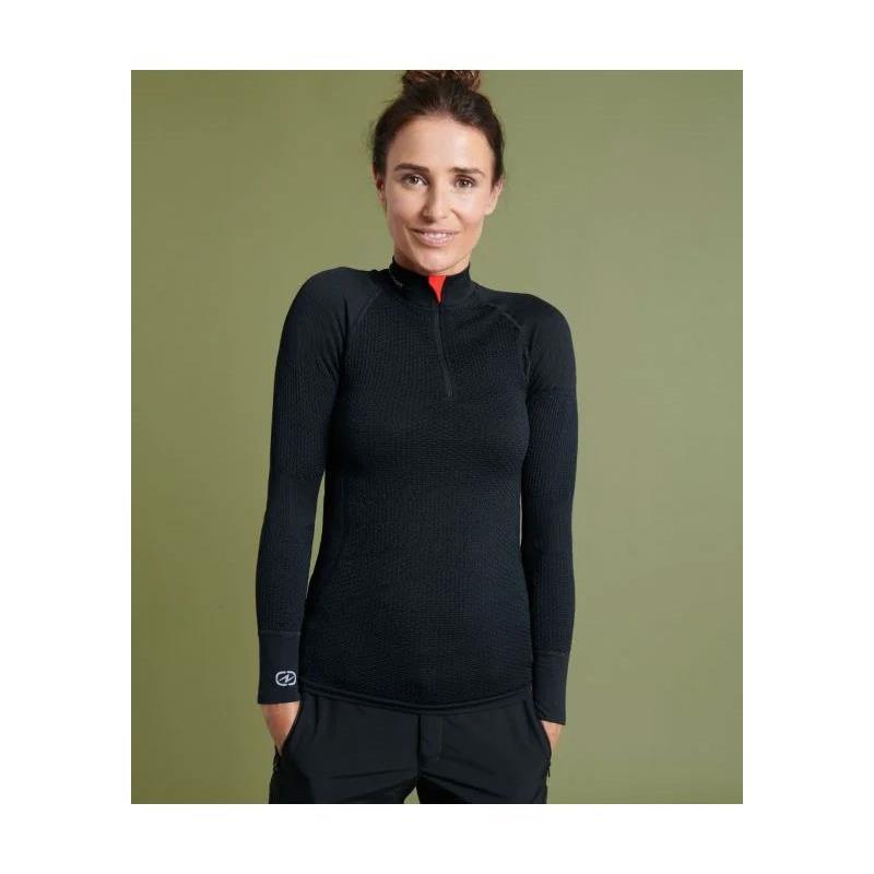 Damart sport's latest innovation: a long-sleeve t-shirt with a zip-up high collar to be worn directly against the skin for all your intense outdoor sporting activities (skiing, cycling, running, etc...). Its highly elaborate knitting is able to reflect the body's infrared rays, thus giving it a strong thermal insulation capacity for a particularly low weight. Its knit labelled Thermolactyl degree 4 protects against the cold even in wet conditions and ensures good moisture wicking. Localized ventilated knit zones to speed up moisture wicking. Zip-up high collar with chin-protecting tab, to avoid chafing at the neck or chin. Ergonomic flat seams without side seams for optimally reduced chafing. T-shirt length approx. 60 cm. The black color contains 60% recycled polyester.