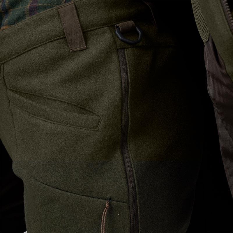 Features : • 70 % polyester/30 % wool, felted wool, bionic ECO finish• Fastening with two snap fasteners • Elevated waist at the back • Piped pockets with easy top access and a D-ring on the left side • Cargo pockets with invisible zip and cartridge holder in the right pocket • Long ventilated zip closures at the side seam • Hybrid structure with waterproof membrane on the lower leg, front and back Harkila size guide