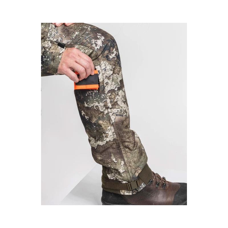 Windproof and waterproof hunting pants featuring details for autumn hunting. The pants are soft and warm with a women's fit, pre-shaped knees and an elasticated waist with two-way stretch panels in the back. The official True Timber® Camou fabric is durable and highly breathable. Side ventilation zippers provide extra airflow. The pants have sealed seams and are treated with the water-repellent BIONIC-FINISH® ECO treatment for waterproofness. Multiple functional pockets with zips and cartridge holders, including a small calf pocket with an integrated safety band. Adjustable hem with zippers, buckles and hook-and-loop. Suspender attachments at the waist.