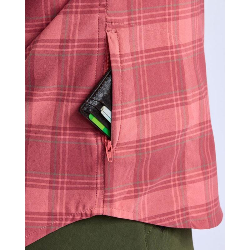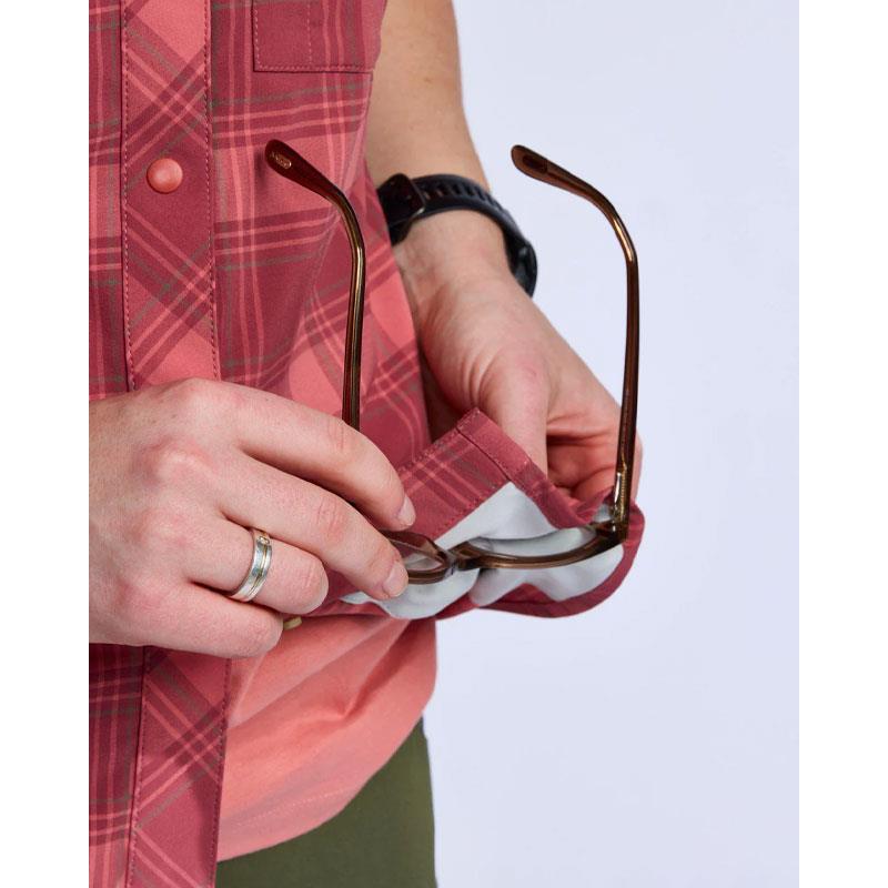 The Abisko Trekking short-sleeved women's t-shirt is made from an exceptionally lightweight, quick-drying fabric that stretches in 4 directions. Its high-density weave offers effective UV protection and benefits from HeiQ Fresh™ treatment, a technology that combats unwanted odours. This t-shirt features a practical snap-button closure and an integrated wipe for easily cleaning your glasses or sunglasses. It has a large zippered chest pocket and a concealed zippered safety pocket in the side seam for securely storing your keys, cards, and other items. Laser-cut ventilation openings under the arms improve coolness. Lightweight and compact, it easily slips into your backpack.