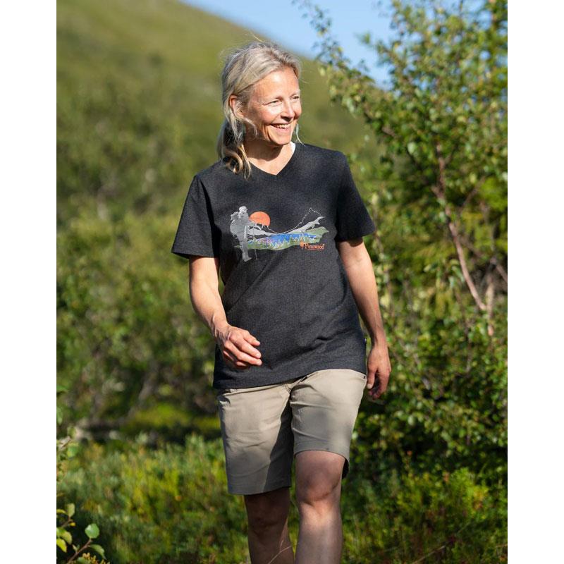 This women's t-shirt is made from 100% recycled materials, combining cotton and polyester. It is crafted in a soft and elegant blend, adorned with a print on the front. Thanks to its colour derived from recycled materials, no new dyeing process is necessary, resulting in significant water and energy savings during production. Its feminine cut features a V-neck.