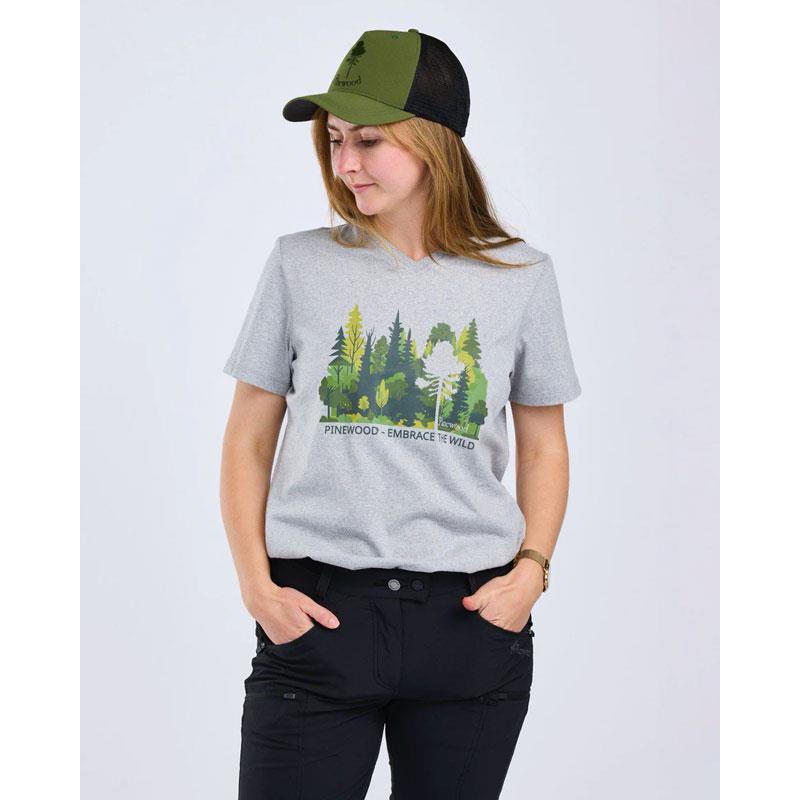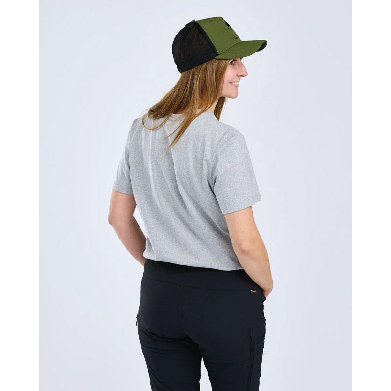 This women's t-shirt is made from 100% recycled materials, combining cotton and polyester. It is crafted in a soft and elegant blend, adorned with a print on the front. Thanks to its colour derived from recycled materials, no new dyeing process is required, resulting in significant water and energy savings during production. Its feminine cut has a V-neck.