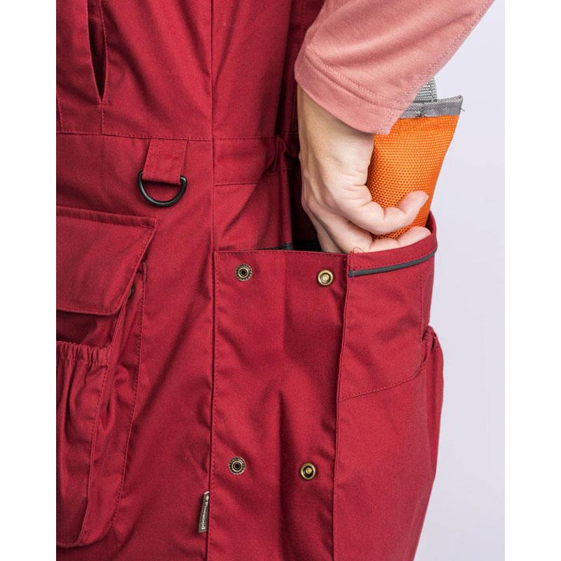 At the back, a large expandable pocket has two compartments for water bottles. This pocket can hold 11 teats of 500 grams each. At the front, two large hand warmer pockets with magnetic closure can be opened for easy access to their contents. The left pocket is equipped with a pouch, ideal for storing your dog's treats.