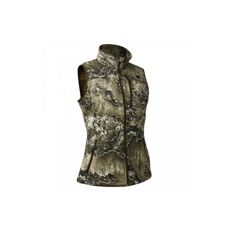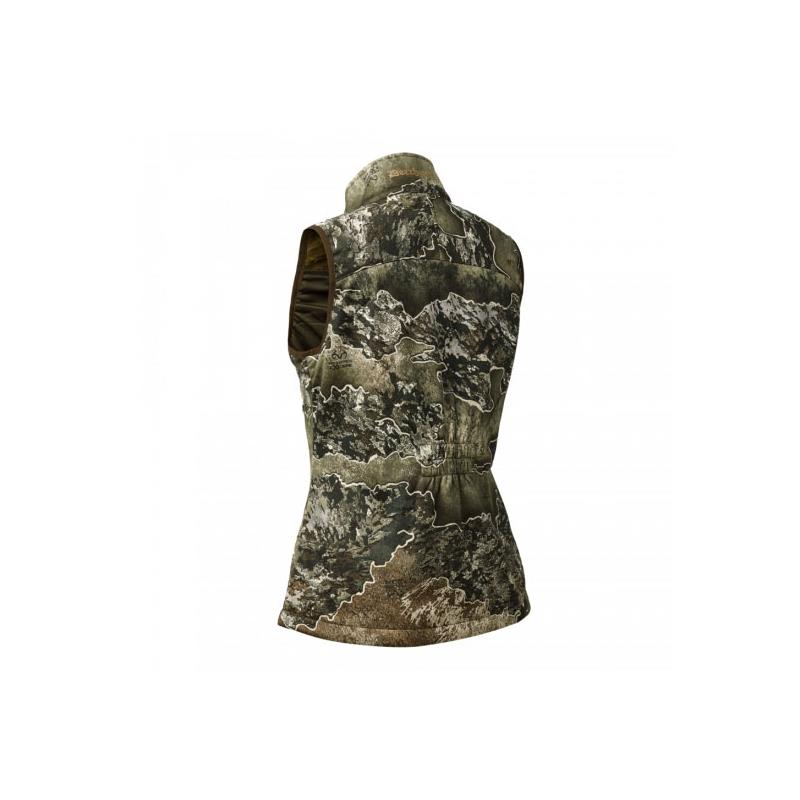 The Lady EXCAPE Deerhunter softshell vest is part of the all-season Excape collection, light, layer-friendly, available in solid color and the revolutionary Realtree EXCAPE™ camouflage pattern. Soft, silent, waterproof, and wind-resistant with the technical Deerhunter Stormliner® membrane in certain areas, this softshell vest is also highly breathable. It has many features and is designed for all types of hunting and to withstand the forces of nature. With an elastic insert at the waist and an adjustable drawstring hem, it offers a flattering and feminine fit. The EXCAPE collection is suitable for all seasons and can be layered to suit the type of hunting you do.