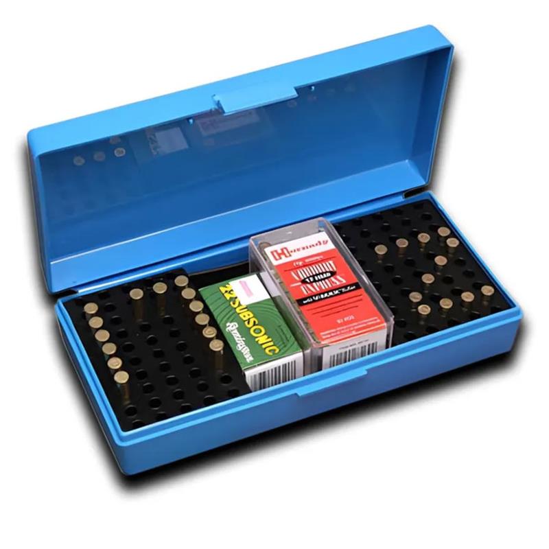 The SB-200 ammunition box in blue was designed not only for 22 Long Rifle Rimfire competitors, but also for hunters. It can easily accommodate 100 cartridges in the low position for easy access during the competition. The space in the center allows up to 3 boxes of 50 cartridges to be stored. Recently reorganised, it now suits the 17 HMR, The quantity contained in each box depends on the paper or plastic box in which the ammunition was originally delivered.