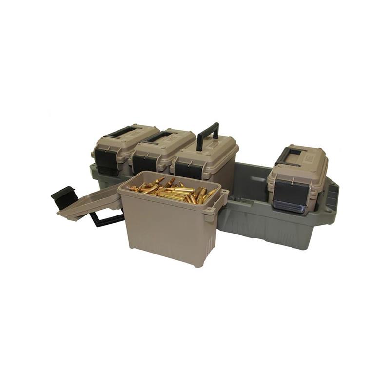 Use this case to facilitate the transport of various calibre ammunition. 2 side carry handles Stackable and easy to secure with four attachment points for the VHL. External dimensions: 62.5 x 21 x 17.8 cm (H) Carries 5 mini ammunition boxes (AC15) sealed with an O-ring for storage of various calibre ammunition. The mini ammunition boxes are a practical size (21.3 x 11.2 x 17.3 cm high) and can hold 650 rounds of 9mm in bulk. Colours: Army green and Dark Earth brown for the boxes (DEAG) Made in the USA