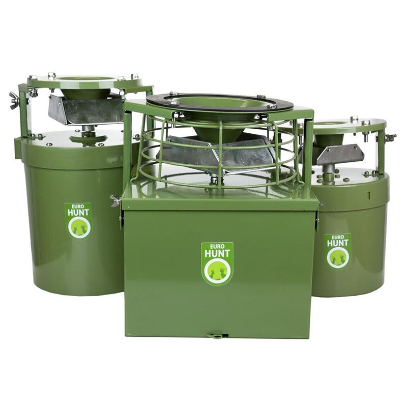 Wild food spreader 12 V with robust and weather-resistant metal casing, lockable with a padlock (not included), controlled by digital clock, distribution (1 to 6 times a day) freely programmable, amount of food (1 to 60 seconds per distribution process) programmable, engine power adjustable between 100%, 75% and 50%, 24-hour operation (am, pm). Operation possible via 12V battery block and solar panel (battery and solar panel not included). (For guarding, please respect the hunting code).