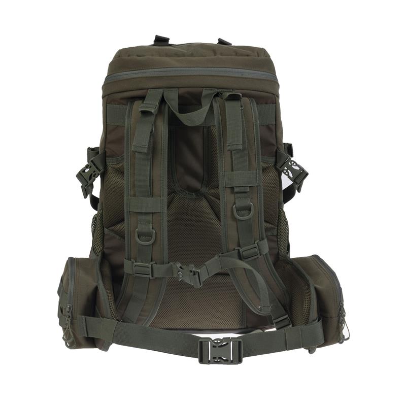 Features: • Technical and silent hunting backpack, made from brushed politricot fabric that is water resistant. • Padding system on the back with anatomically placed breathable mesh parts to enhance comfort and ventilation. • Adjustable height via the shoulder straps, sliding adjustable chest strap with emergency whistle and compass, and a belt with adjusters. • Equipped with an easy access front system for gun attachment. • Adjustable and retractable bag in the lower pocket to securely hold and adjust the gunstock. • Neoprane parts in the front to gently embrace and support the gun's handguard and sight. • Upper MOLLE system with adjustable straps to keep the barrel in place. • This complete attachment system is padded with a layer of foam inside for increased protection and comfort. • Three levels of zippered pockets in the front provide a progression in available storage space. • The middle pocket has a mesh pocket that can hold a box of ammunition and a removable ball holder with Velcro, which also works in the storage systems of several of our jackets. • A zippered pocket, a MOLLE band and adjustable straps placed on the closing flap allow for increased large load capacity in the largest pocket near the back. • Equipped with functional attachment points and adjustable straps on both sides. • Two side mesh pockets for bottles or other accessories, and two handy zippered pockets with padded bases on the belt for easy access to the storage of most used items. • Removable rain cover in the zippered pocket at the base.
