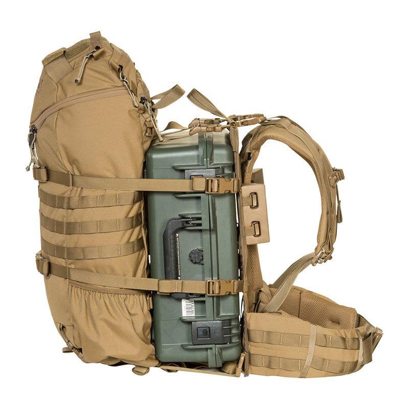 The Overload 49-liter quick-access mission bag has the ability to secure and transport weapons, including those of precision shooters, as well as rigid-type cases between the harness and the main compartment of the bag. It is equipped with the NICE carrying frame and the FUTURA harness which is fully adjustable and provides stability and comfort for carrying loads. The BVS buffer system stabilizes the load and provides excellent back ventilation.