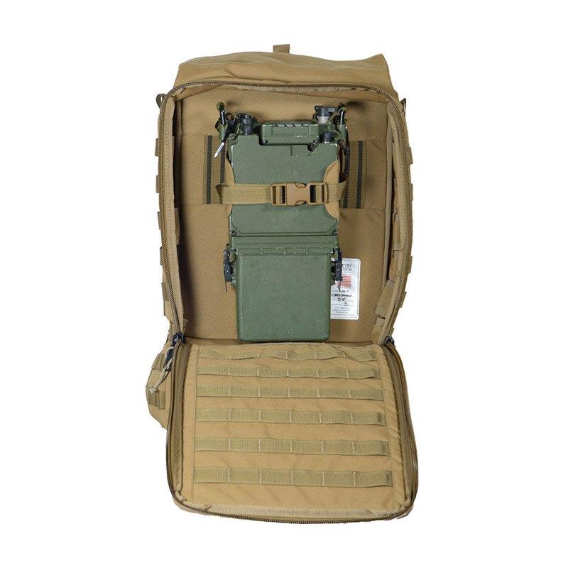 Features: • Evolving backpack depending on the missions or the equipment • NICE carrying frame for comfort and stability under the heaviest loads • Ventilation and stability system (BVS) on the frame • Adjustable FUTURA harness according to the length of the back • Window to view the radio keyboard and screen • Velcro® passage at the top for cables and antennas • Velcro® access to the keyboard from the top • Compatible with PRC117F, G or similar models • The battery compartment can hold up to 4 5590 or 2590 batteries • PALS loops on the front, sides and belt to attach MOLLE accessories • Routing of power cables to the main compartment • Padded belly band • Weight: 3.4 kg • Volume: 18 liters • Dimensions: 57.7 x 35.5 x 30.5 cm • 500D Cordura® with Teflon® and PU coverings for UV and weather protection • Waterproof YKK® zippers • Made in USA