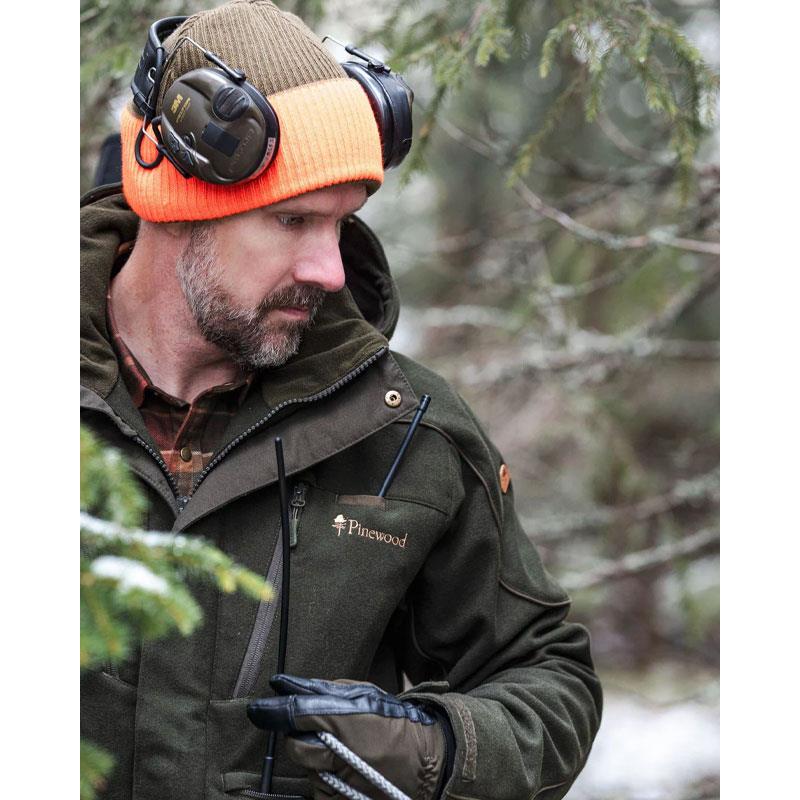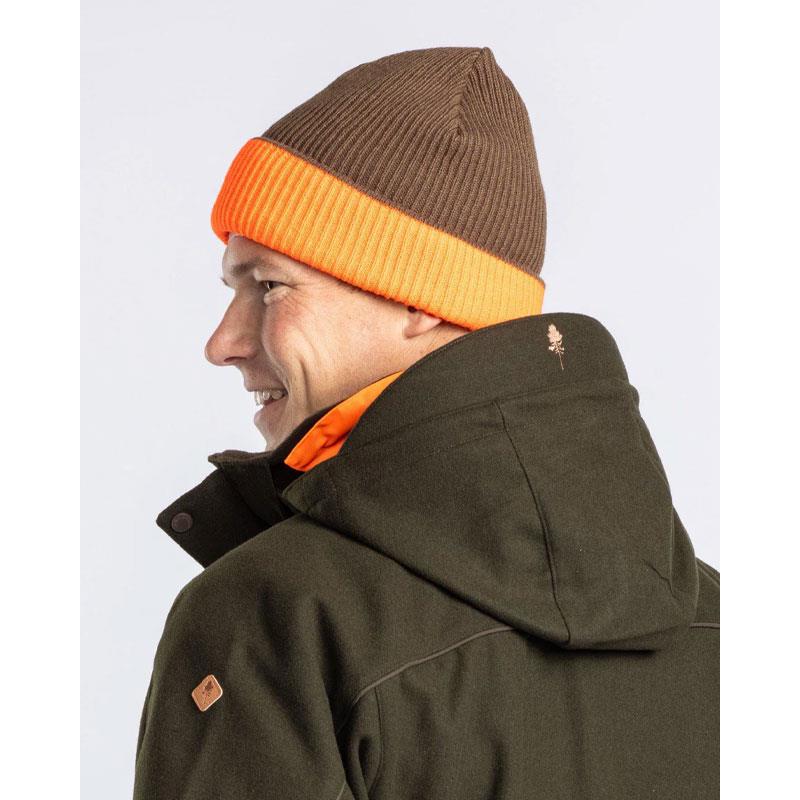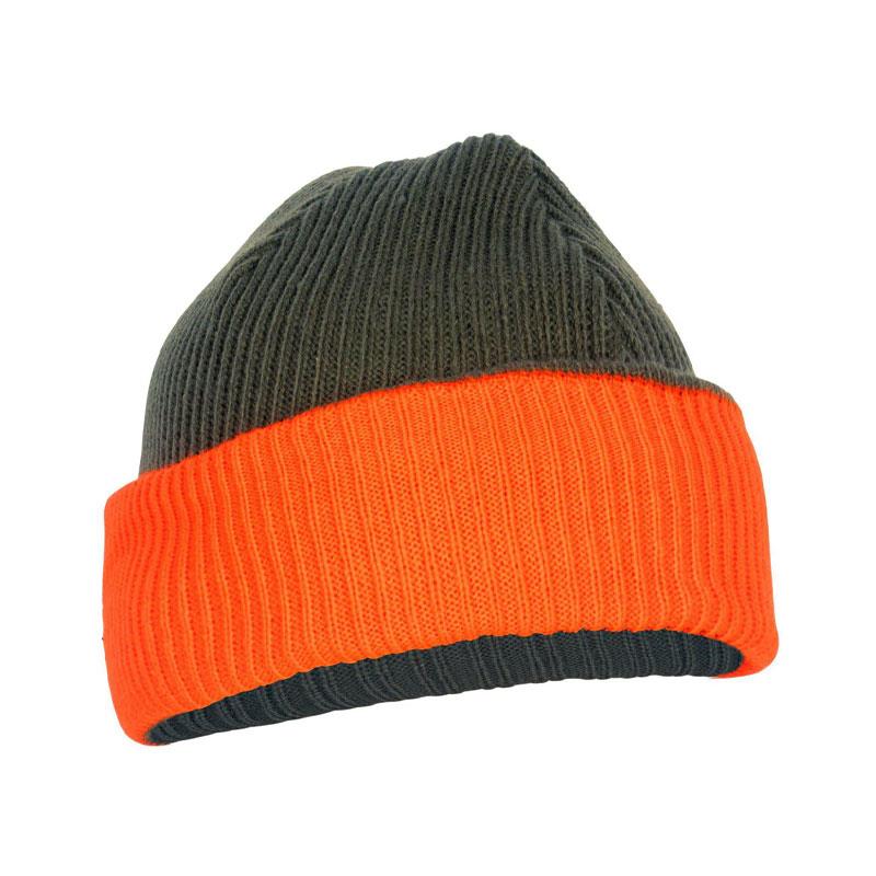 Reversible warm mixed woolen beanie, with a plain green side and a green side with orange edging. Ideal for forest outings or hunting, for better visibility.