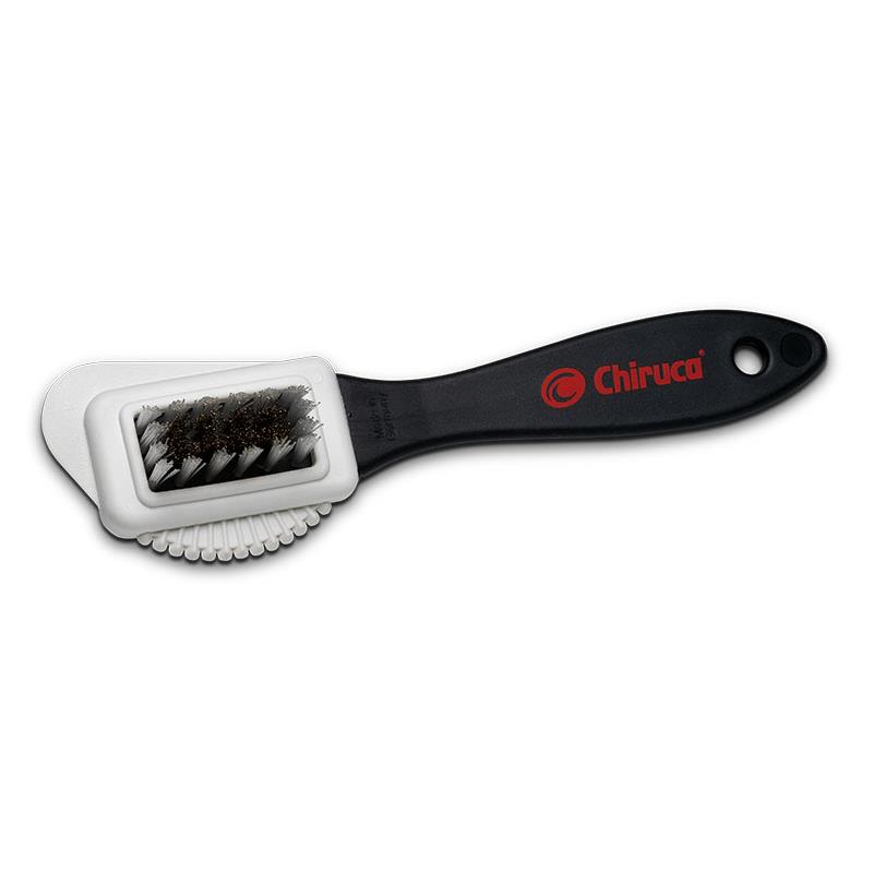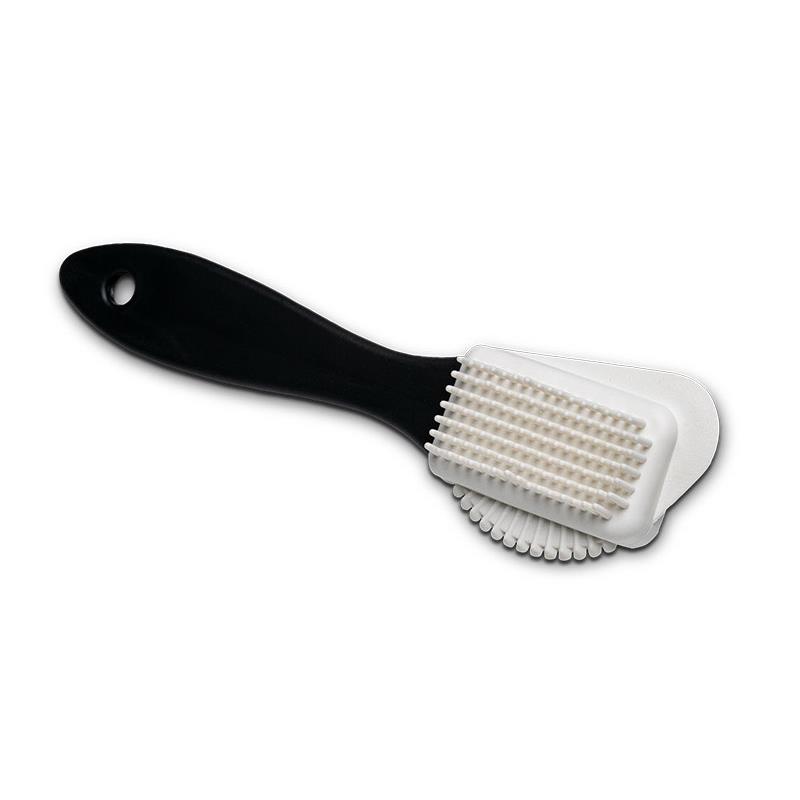Brush for shoe cleanliness. Suitable for leather crust and nubuck. The synthetic side is used to remove dust/earth and to revive the crust and the nubuck. The synthetic side cleaning cleanses deeply the seams of the shoes and hard-to-reach places. The nylon side revives the crust and the nubuck.