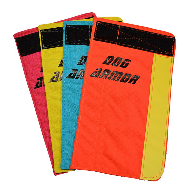 Colored dorsal flap allowing identification and differentiation of dogs. The dorsal flap, originally sold in orange, is offered in 3 other colors: blue, yellow and pink. Flap attached to the vest by a zipper and hook-and-loop straps