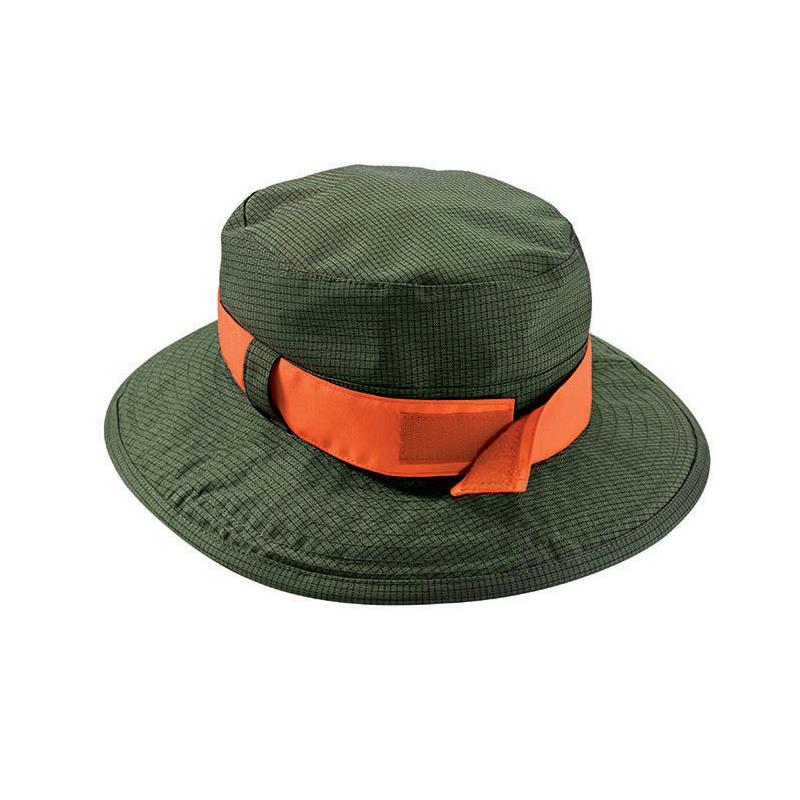 Waterproof Cordura ristop hat with RISERVAtex lining inside and removable fluorescent orange band.