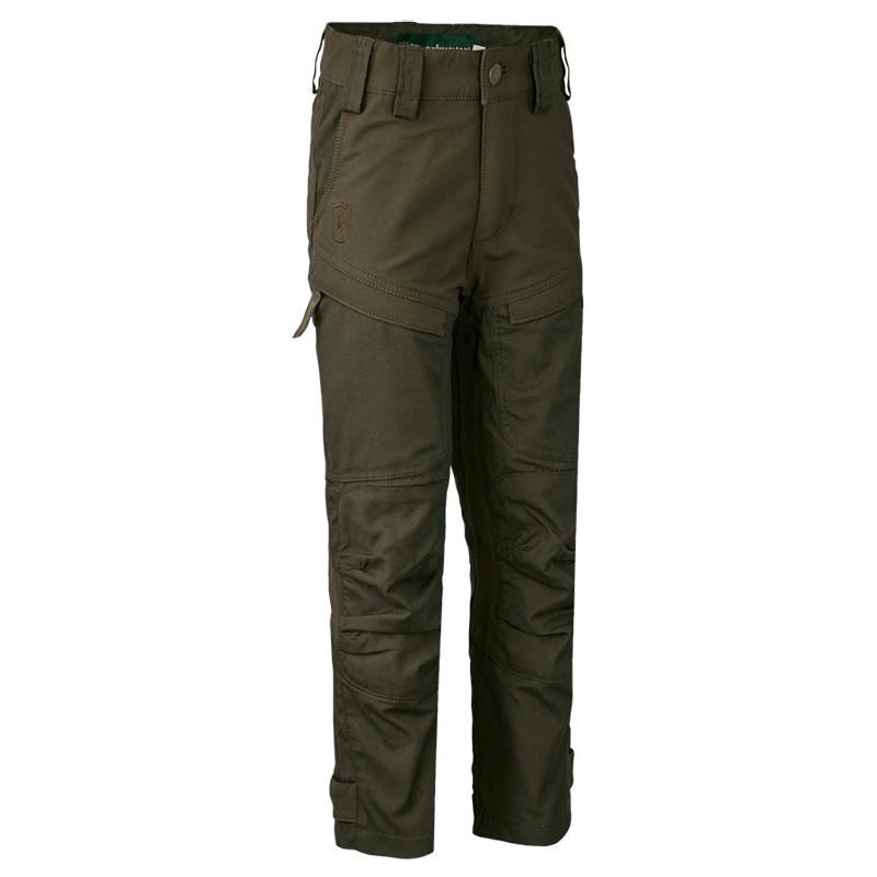 The Youth Strike Deerhunter trousers were created with durability in mind for young outdoor adventure enthusiasts. Available in an elegant dark green colour, with stretch in width and length, the Youth Strike trousers are designed for outdoor activities. They are built with a multitude of features to suit the most active children. Among these are an elastic waistband, pre-shaped knees, an adjustable ankle strap with Velcro and a selection of cleverly placed pockets with zippers to protect all their everyday treasures. This sturdy trouser features Teflon Shield protection and Oeko-Tex certification to withstand anything.