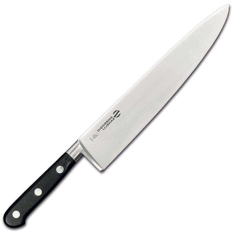 Key Features • The best quality of steel for a perfect cutting edge and a long lifespan • A single piece of steel for blade and handle ensures high strength and excellent balance • POM resin handle, shock resistant and hygienic, dishwasher compatible • Perfect maintenance of the plates on the tang thanks to the rivets, without risk of crack • Chef model • This chef's knife is a real all-purpose knife.