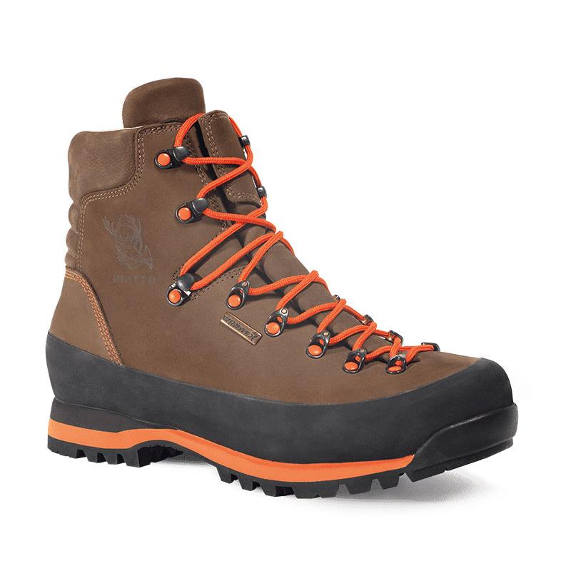 Frosted nubuck leather boot with an upper made from a single piece with a single overlapping fold (DIOTTO patent) that allows water and forest debris to drain away, preventing internal stagnation.