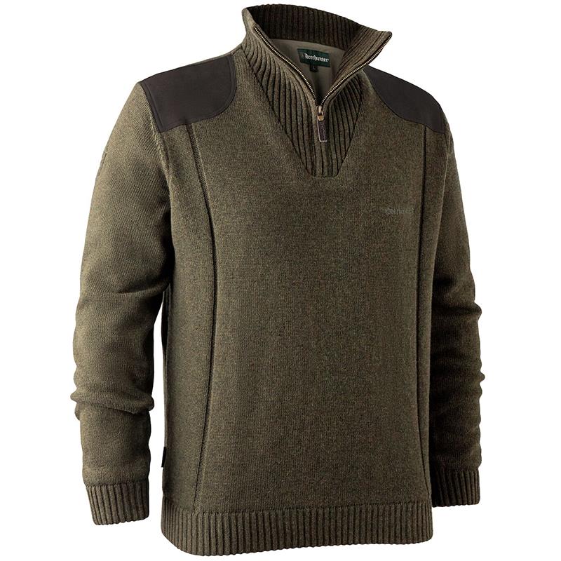 The classic Carlisle sheep wool sweater with a zip collar features elegant suede details on the shoulders and elbows.