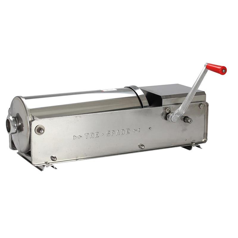 Horizontal all-stainless-steel TRE SPADE 15-litre meat stuffer, very robust, allowing stuffing into casings of all kinds of sausages, salamis, blood sausages without introducing air that rapidly spoils the meat.