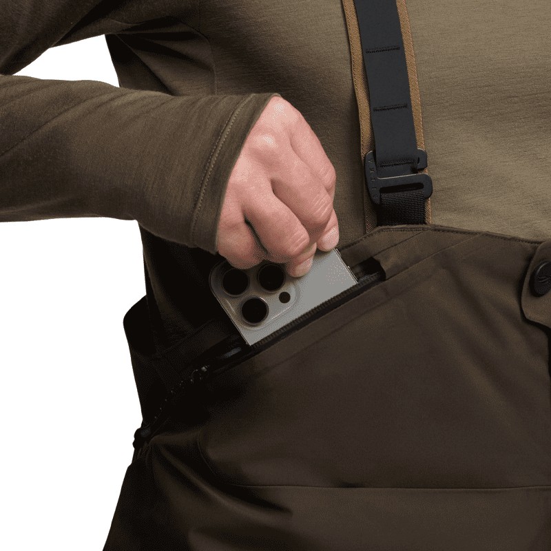 • The 100% waterproof GORE-TEX breathable fabric ensures you stay dry • The 75 denier polyester ripstop face offers light and durable performance • The PrimaLoft® Silver 60/40 grey duck down blend provides superior light warmth at the thighs and seat • The 60 g PrimaLoft® Gold with Cross Core™ technology adds uncompromised warmth in the upper chest area for optimum body heat • The gusseted zip pockets on the thighs offer easy and secure access to accessories • The zipped chest pocket keeps essential items secure and within easy reach • The fully adjustable suspenders allow for a perfect and custom fit