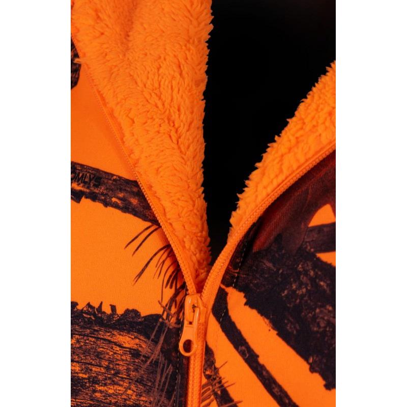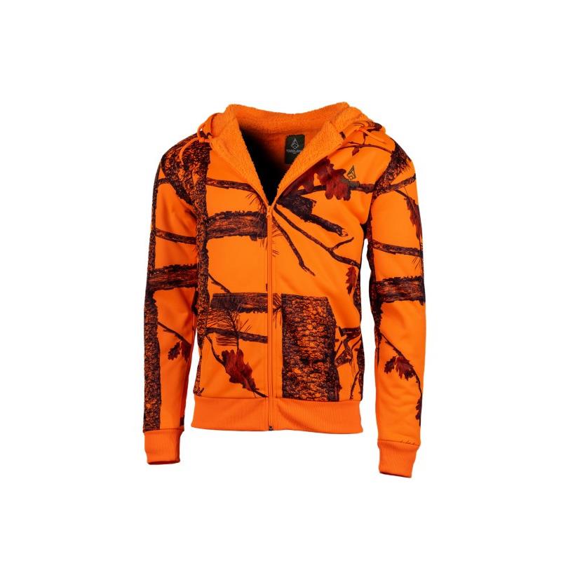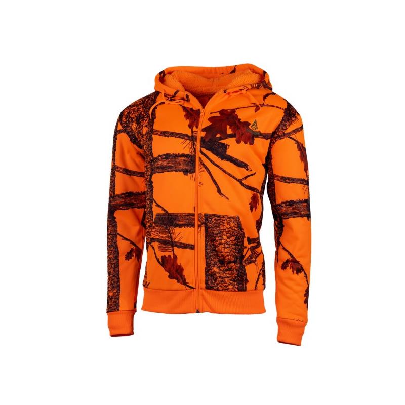Hooded zip-up sweatshirts, available in green or orange camouflage, with a warm fleece lining in a "hair" style.