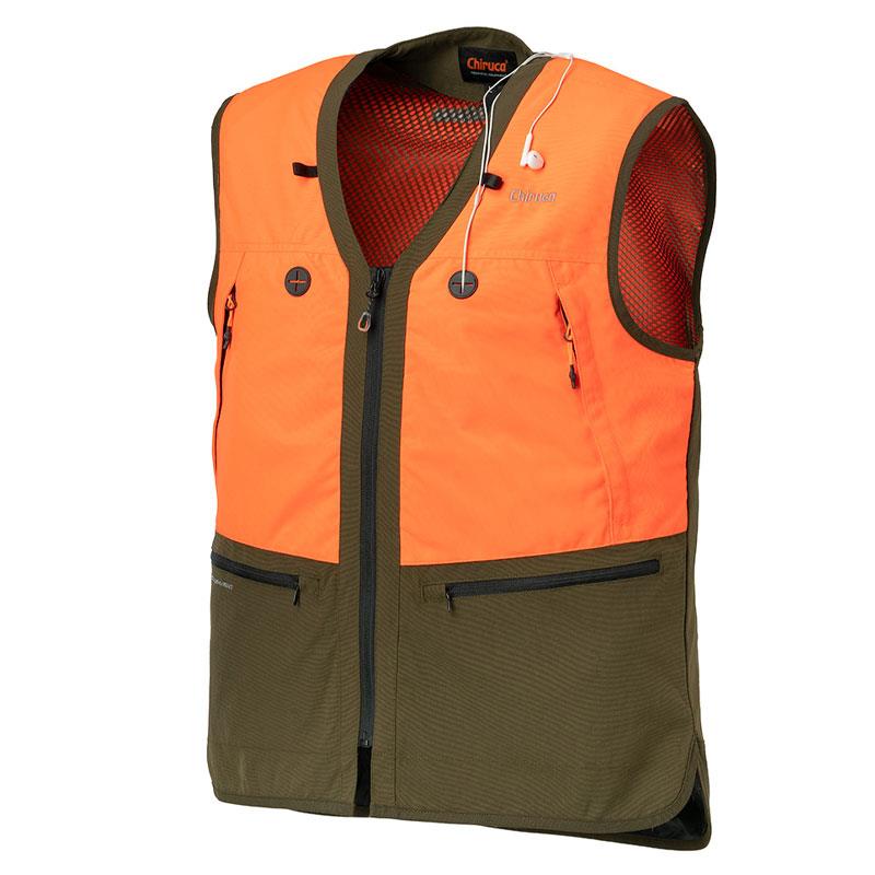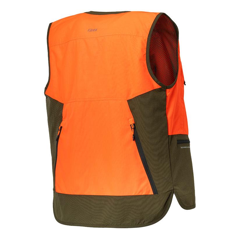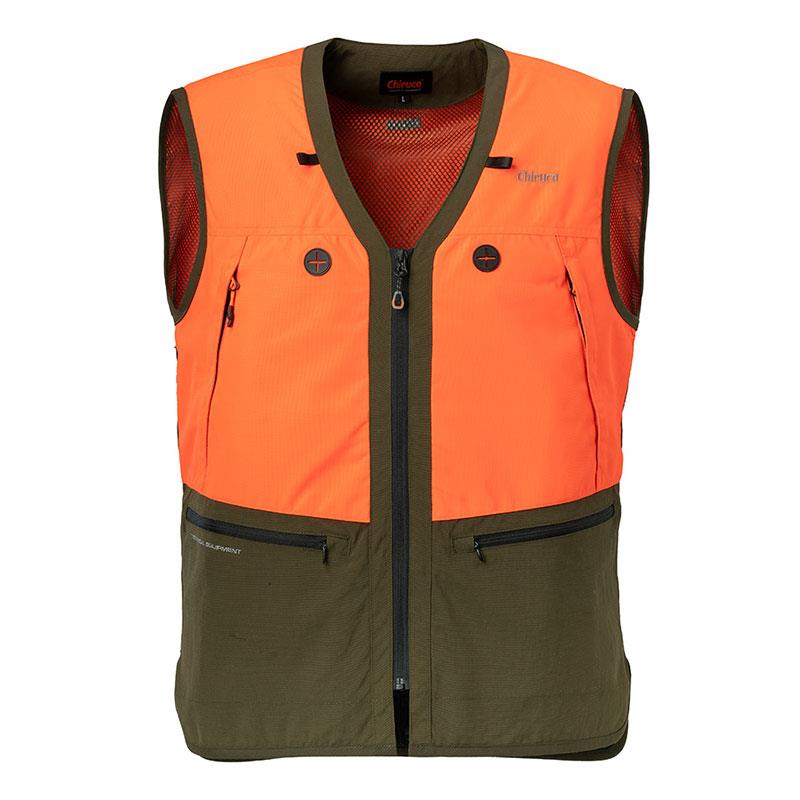 High visibility orange big game hunting vest, compliant with European legislation on personal protective equipment. Very resistant and comfortable fabric to wear over jacket. It's versatile and lightweight with multiple pockets.