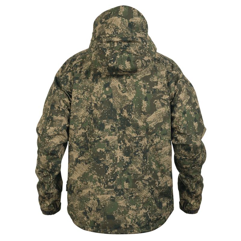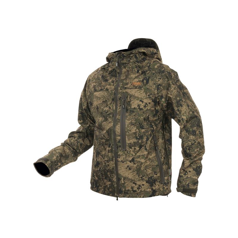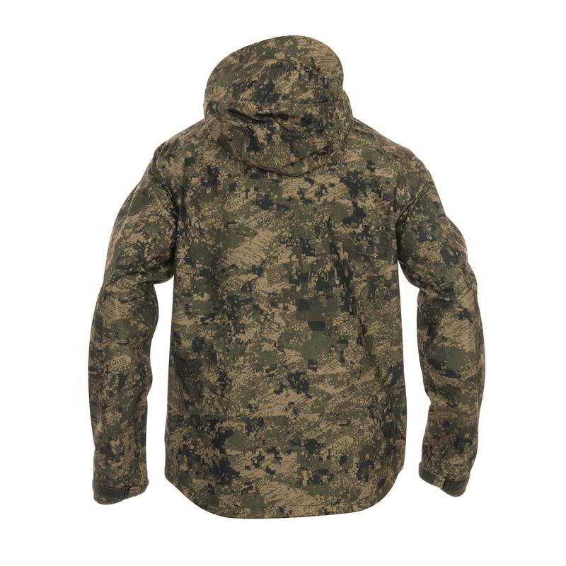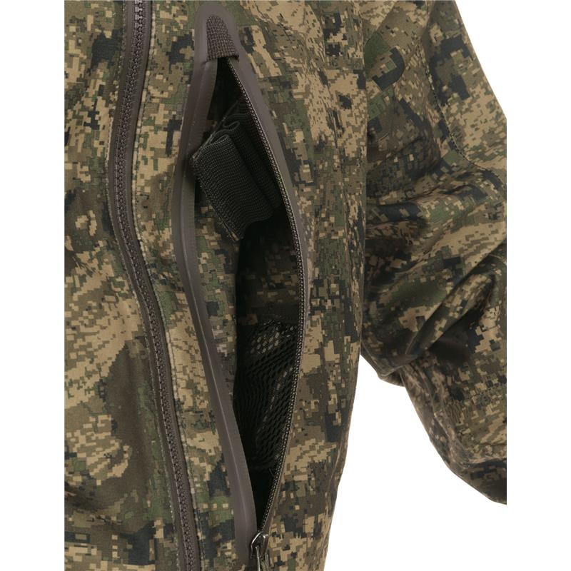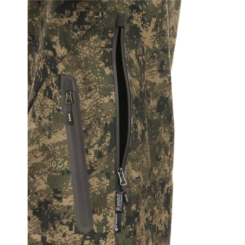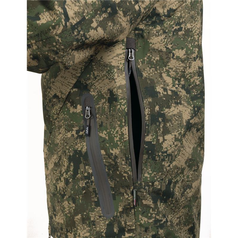 Uncompromising tri-laminate fabric composition creates the most waterproof and windproof construction, but also the most breathable. The inner layer of graphene regulates body temperature and acts as a filter between the skin and the environment, evacuating heat in warm weather and preserving and evenly distributing body heat in colder climates.The strategically placed mid-body cargo pocket offers large storage capacity and conceals specific pockets for different tools such as a radio/GPS, a mobile phone and a detachable cartridge holder for bullets. The media port allows the headphone wire to be routed inside the jacket. All your accessories will be within reach, but protected against unwanted snags in the bushes.