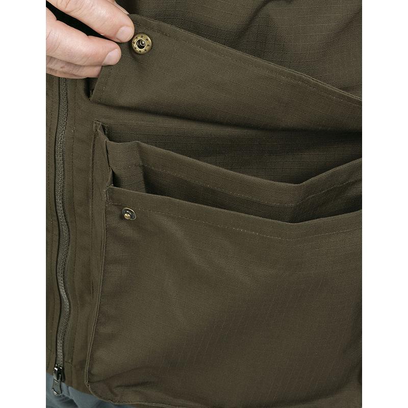 Made from durable Rip Stop tear-resistant fabric with a water-repellent cotton blend. Elastic pieces for more comfort and mobility. Zippered radio-GPS pocket on the chest with media port (also equipped with a hole and loop guide for the antenna). Internal zippered pocket on the chest. Reinforced cargo pockets with double compartment and with a large button closing capacity. Game bag with Vislon zipper. Adjustable bottom.