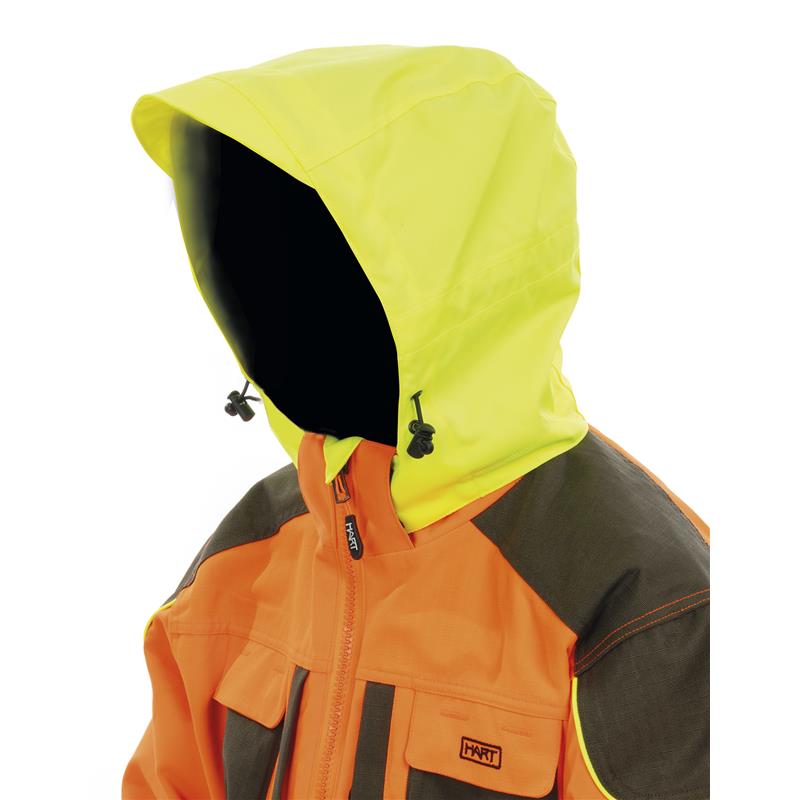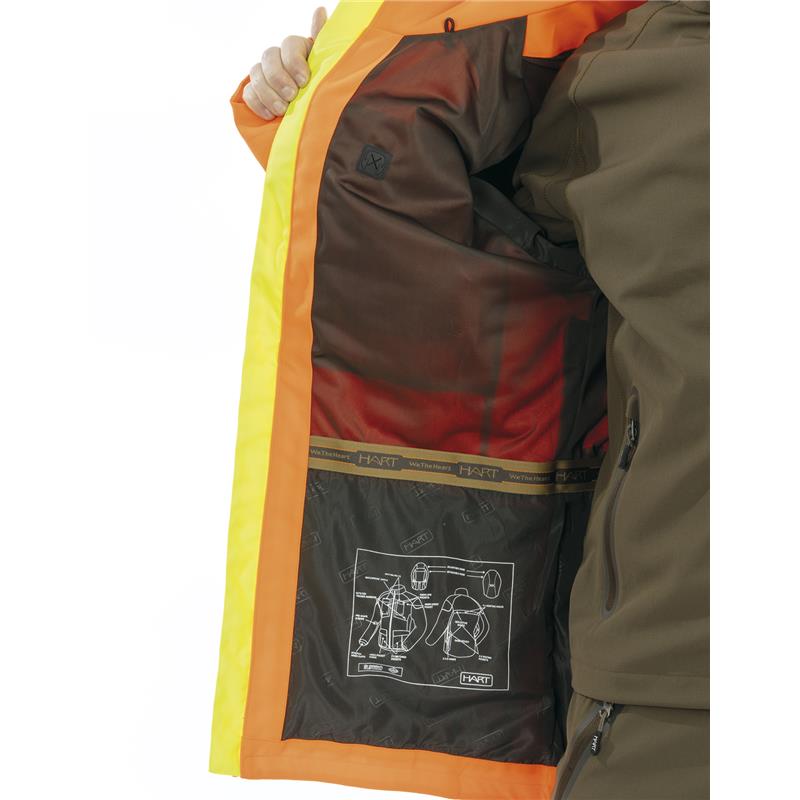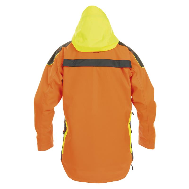 • Chest pockets with zips including eyelets for tracer ribbons. • Chest pocket for radio/GPS on both sides. • Connection ports inside for earphones. • Waterproof ventilation pockets with zip fastening and rear panel for improved breathability. • Removable high-visibility zip hood. • Reflective black stripes on the back and sides. • Game pocket on the back. • D-rings on the sides. • Inside pockets: zipped chest pocket for documents and lower cargo pocket for the hood when it's detached. • PU laminated membrane and sealed seams. • High waterproofing (10000mm) and breathability (10000 gr/m2).
