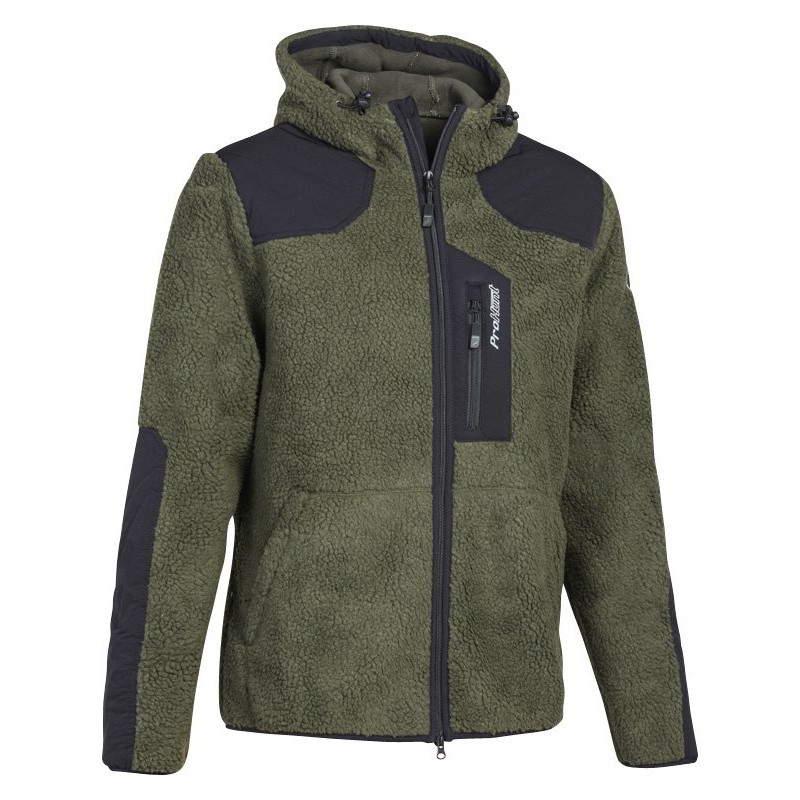 Features: • Very warm fleece jacket. • Sherpa fleece 480g/m2, long hair glued on the inside and woolly on the outside. • Contrast elbow patch. • Double slider front zip. • One chest pocket and two zippered lower pockets. • Adjustable hood