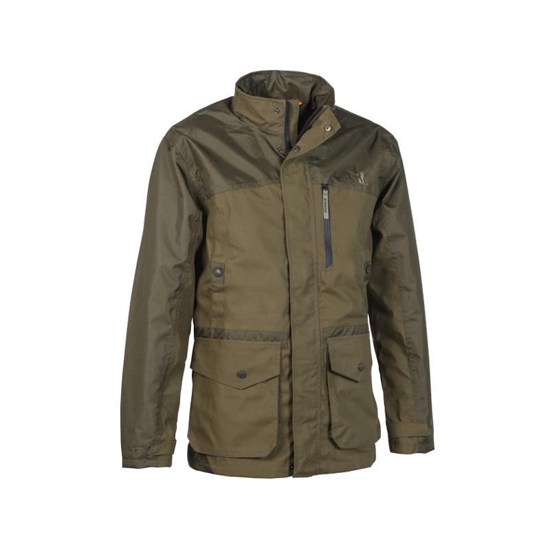 Features: • 65% polyester, 35% cotton, with polyurethane membrane, waterproof and breathable, sealed seams, 100% ripstop 300 denier polyester reinforcement on shoulders and arms. • 100% polyester taffeta lining. • 2 large lower pockets with integrated cartridge belts, 2 hand-rest pockets, 1 chest pocket, 3 internal pockets including 1 phone pocket. • Hood integrated in the collar and detachable, game carrier ring. • Game bag with waterproof and washable lining, detachable on two sides.