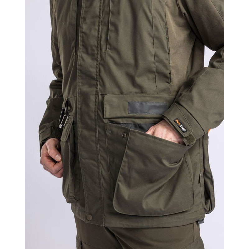 The jacket includes several thoughtfully designed pockets, such as an expandable rear bellows pocket with two compartments for water bottles, so you and your dog can stay hydrated throughout the day. The rear pocket can hold 11 dummies of 500 grams each. Lined with an easy-to-clean material, these pockets are ideal for storing treats and training equipment. The jacket also features a removable hood, two large front pockets with buttons and magnets for quick access and closing, reflective details for improved visibility in the dark and fleece-lined hand-warmer pockets. It also includes two chest pockets, an inner zip pocket, cuffs with thumb holes for extra warmth and adjustable Velcro tabs at the sleeve ends. The jacket is fastened with a two-way zip and features a windproof placket with concealed snap buttons and an adjustable drawstring at the hem. At the waist, a carabiner and D-ring are provided for attaching equipment.