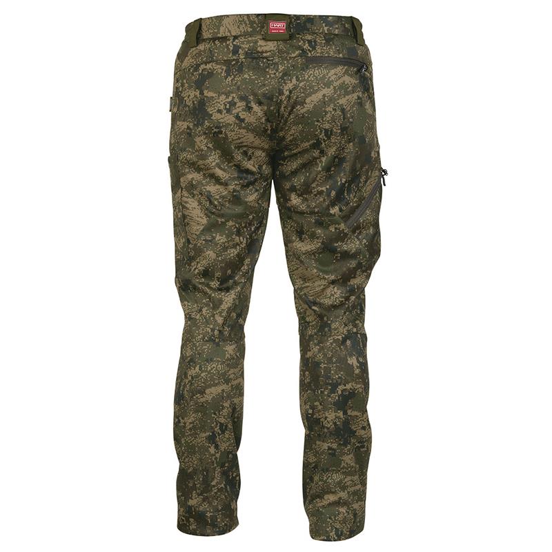 Made from an extremely quiet, stretchable, soft and highly breathable fabric, with Tanatex® insect-repellent treatment (ticks, mosquitoes, flies...). The fabric's micro-points let the slightest breeze through, keeping you cool without sacrificing durability. The fit and elasticity allow a base layer to be worn underneath on the coolest mornings and evenings. Designed with articulated knees allowing a full range of movement without restriction on rough terrain. 4 zippered pocket construction: 2 front pockets, 1 back pocket and 1 slanted side cargo pocket. 1 side pocket for knives. Our PIXEL FOREST camouflage conceals the hunter's silhouette to blend with the surrounding natural scenery. The PIXEL FOREST pattern used has been given a brownish tint, naturally selected to be effective across various terrains throughout the year.